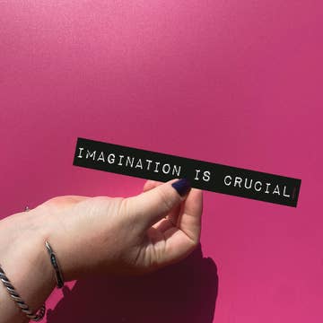 Imagination is CRUCIAL! Nurture it! Explore it! Make time for it! Let your imagination free to play once in a while!! Make wild plans & grand dreams & invent ludicrous things & cackle at the fun & joy of it! Then!! Watch how that imaginative time bursts forth in real life discoveries & problem solving & general well being - let alone any fantastic new inventions or artwork that come to life! Boom! These mini-bumper stickers help spread the good Mirthos infused word with poetic musings in the font from those old label makers for bold impact of the most sincerely silly kind. Great on notebooks or cars or anywhere in between! Imagination is Crucial is a high quality vinyl sticker, waterproof, dish washer proof, road dirt proof! 8" long x 1" tall.