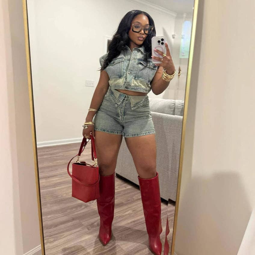 Step up your streetwear game with this stylish two-piece denim set. The outfit features a cropped zip-up jacket with a structured design, long sleeves, and a high neckline for a modern, edgy look. It pairs perfectly with the matching high-waist jeans, which offer a flattering, body-contouring fit and bold seam detailing for added dimension. This versatile set can be dressed up with heels and accessories for a chic going-out look or styled casually with sneakers for everyday wear. Perfect for fashion-forward wardrobes, it’s a must-have statement set that blends comfort, structure, and trend.