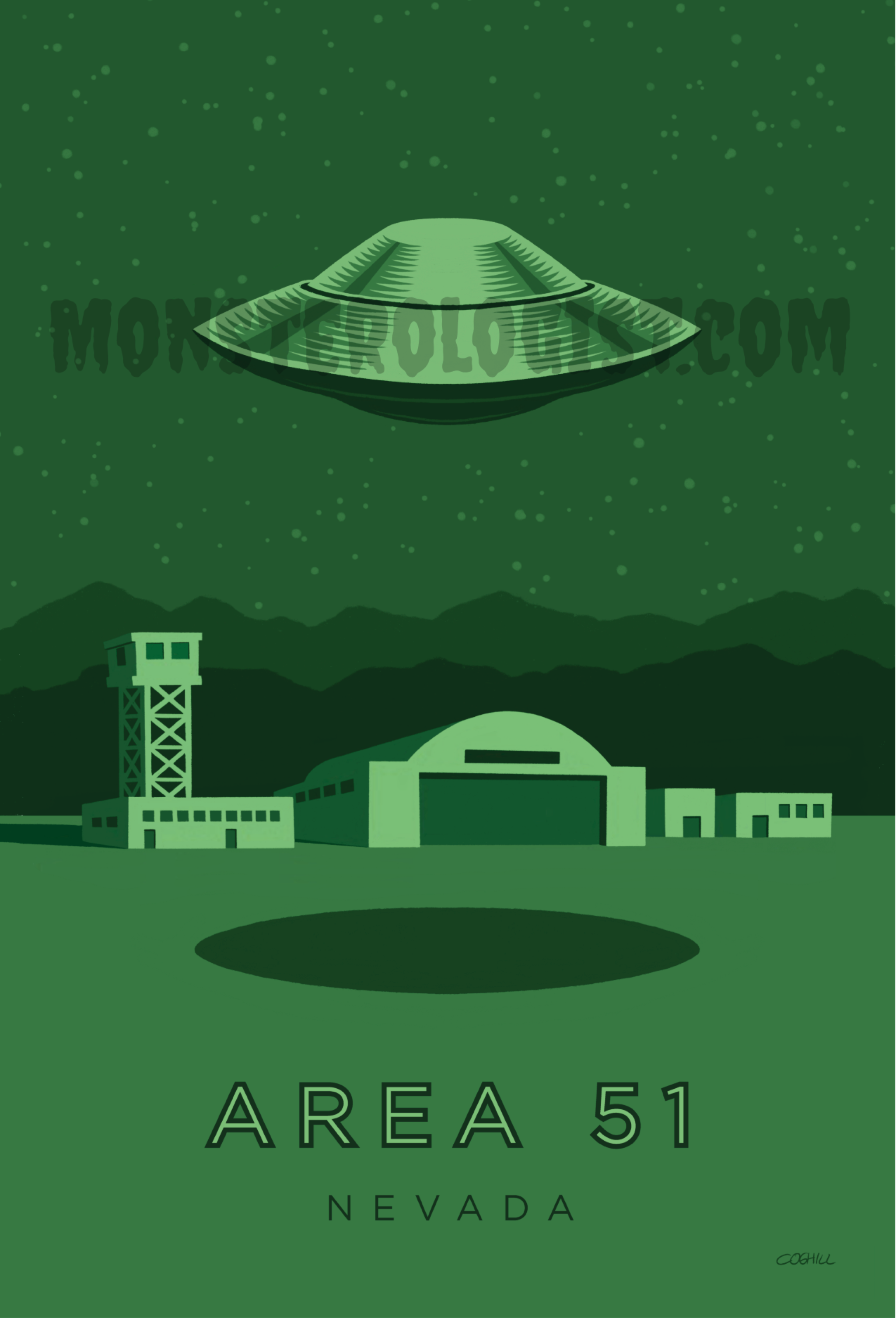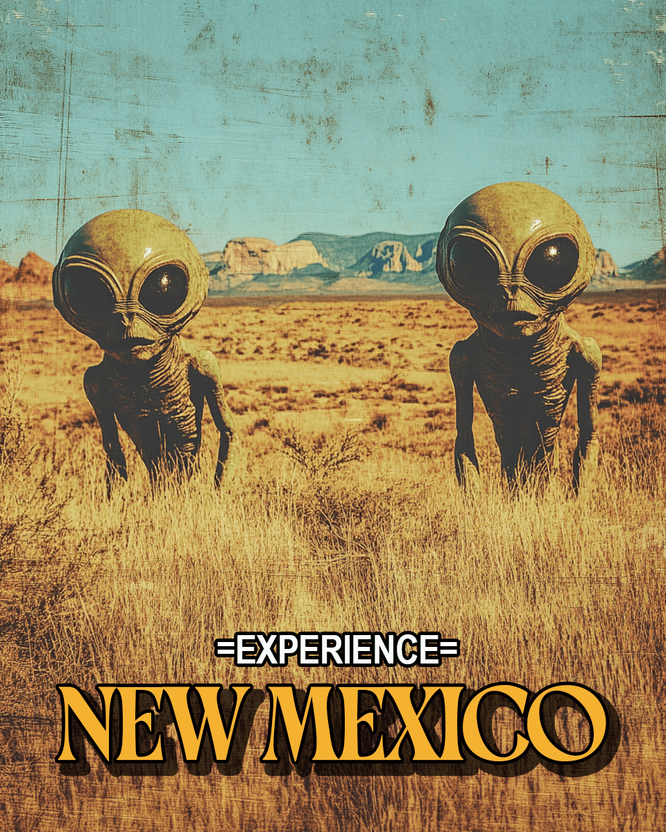 Roswell, New Mexico vintage travel poster inspired by vintage and mid-century travel posters. Featuring the infamous UFO crash and alien bodies from the 1947 incident. * 4" x 6" art print * printed on 14-point card stock * matte finish * reverse side is blank