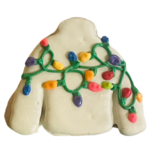 Two Tree Shaped Cookies With Yogurt Frosting Sandwiched Between Them And Red & Green Sprinkles Baked In Ingredients: Chickpea Flour, Peanut Butter, Applesauce, & Molasses With Yogurt Frosting & Tapioca Sprinkles With Red Polka Dot Packaging