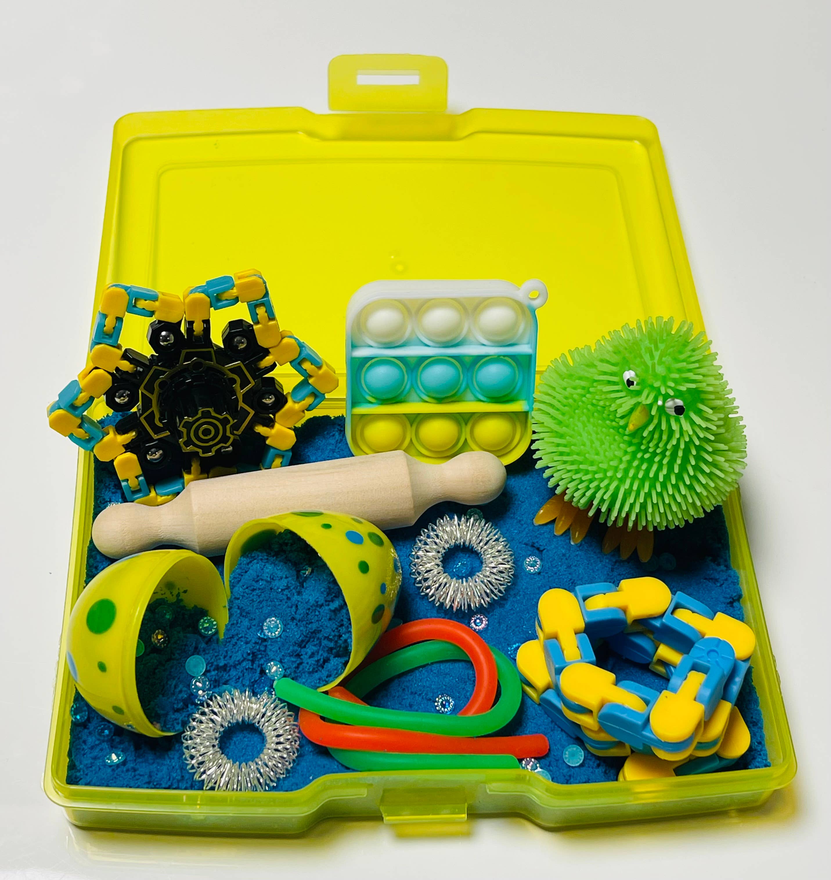 Happy Bunny Sensory Rice Sensory Kit What a great kids gift for the busiest of hands and minds. Everything inside can be played with including the sensory rice that comes with a play shovel. Both bunny and heart are pop it keychains and can be transported wherever you go! All this fun comes inside of a portable travel sized plastic storage case with clasp to keep the entire kit secure. This gift is perfect for travel for kids! Limited quantity available! The case color (pink, purple, blue, teal, orange, yellow) can be changed at no additional cost, just leave us a message