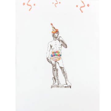 Make their birthday a classic with this fun birthday card featuring a statue of The David wearing a birthday cake and party hat all hand embellished with fine glitter. Blank inside. Individually sleeved. Size: 4.25 x 5.5 Made in USA.