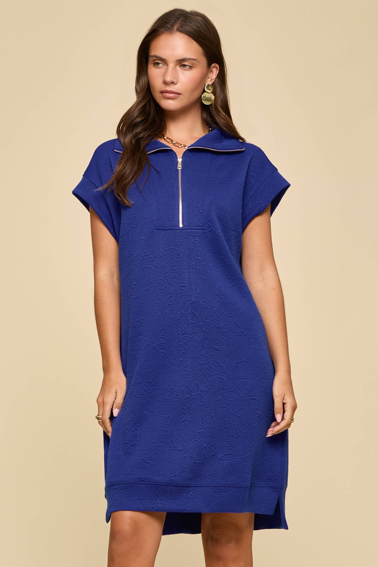 - SHORT SLEEVE 1/2 ZIP STUDED WASHED MINI DRESS WITH POCKETS - MODEL IS 5'8" AND WEARING SIZE SMALL - 100%COTTON
