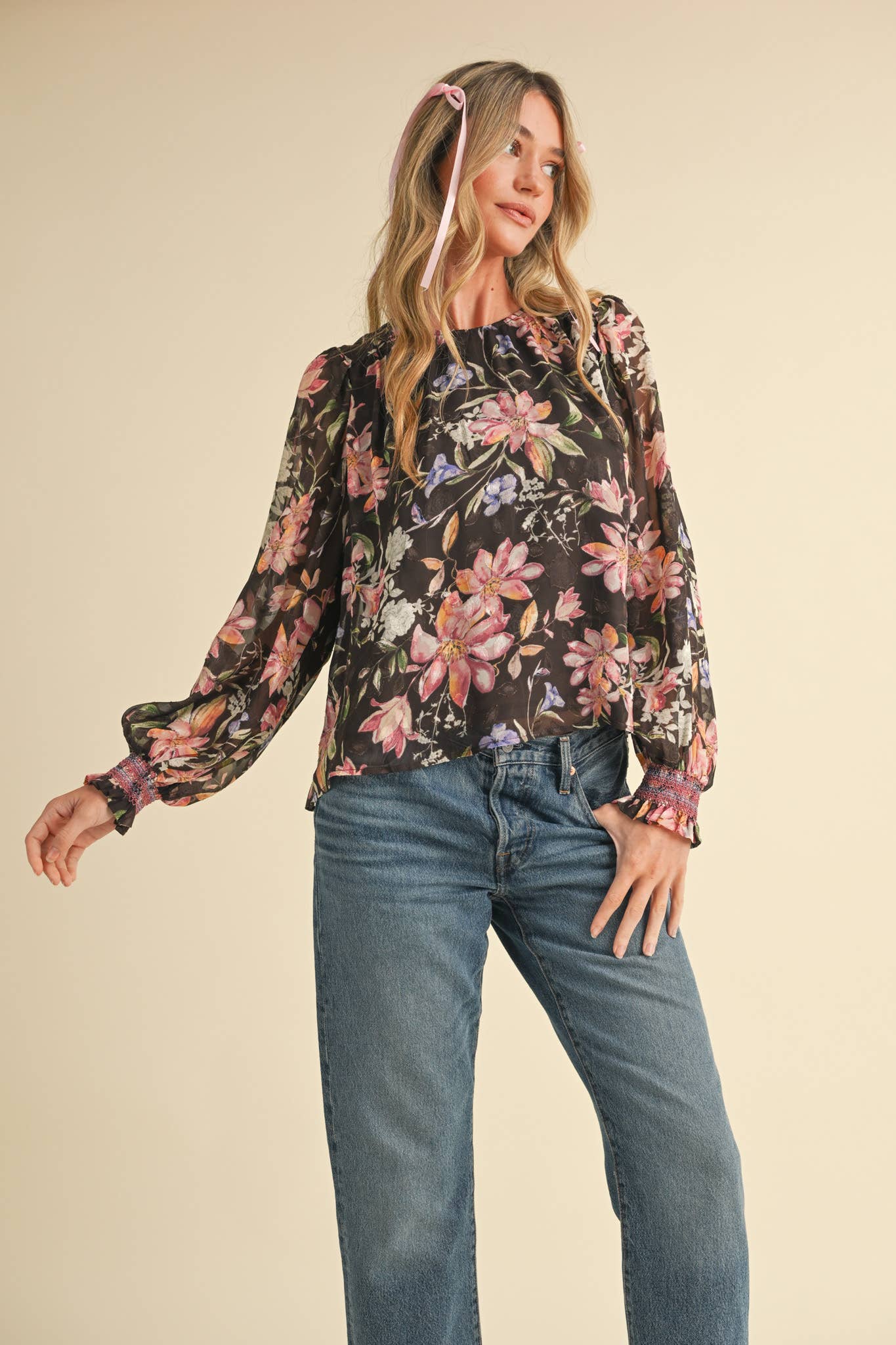 STRIPE TEXTURE PUFF SLEEVE SWEATER MSW9485