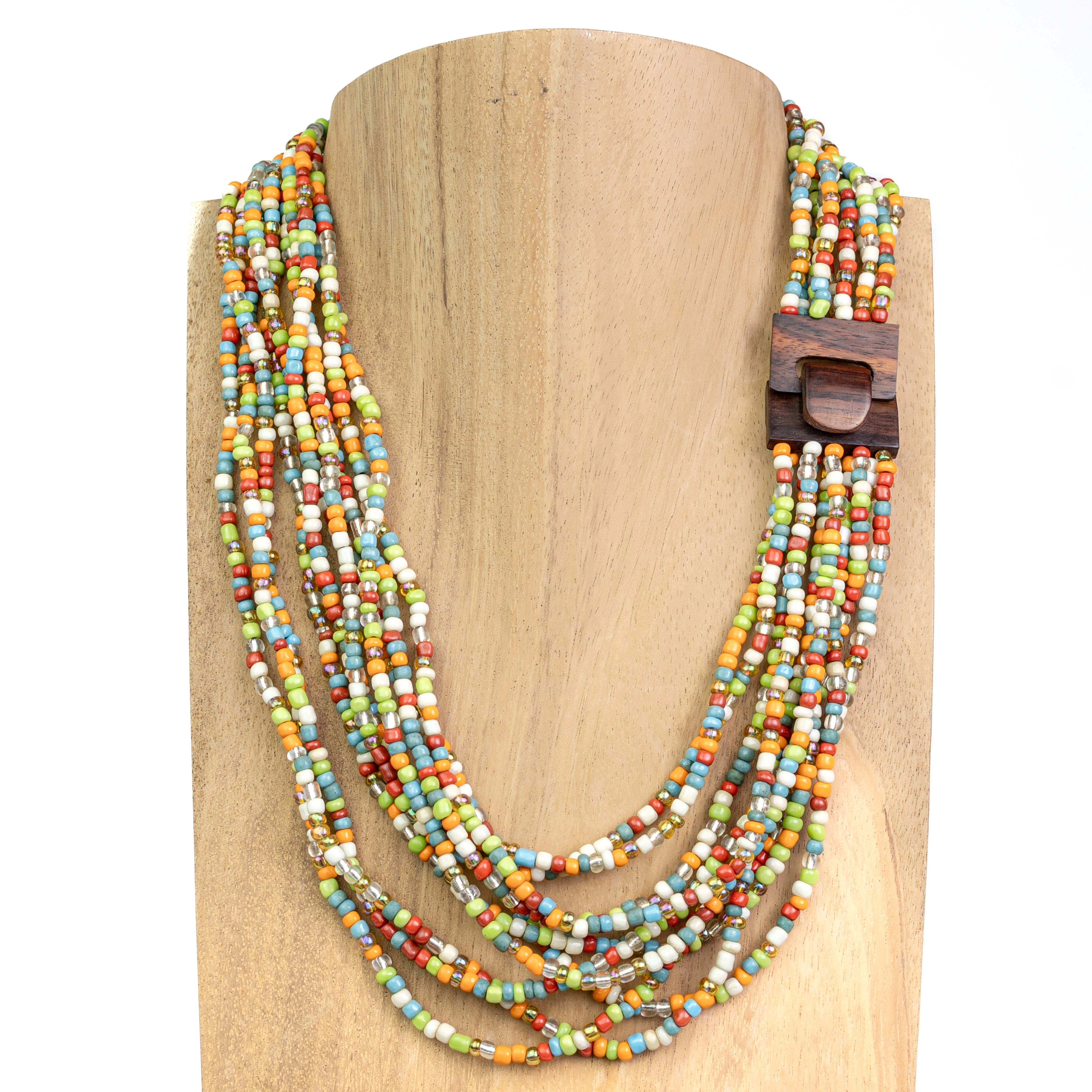 An adorable smaller version of our best selling Wood Buckle Bracelet! This bracelet is a handcrafted beaded cuff featuring 10 strands of Bali glass beads, available in 5 fun color mixes, strung on sturdy elastic. The beautiful hand carved 1" rosewood buckle adds a natural statement to the design. The wood has a rich, warm tone that contrasts beautifully with the colorful beads, making it a stylish and unique accessory for every outfit. This versatile bracelet can be dressed up or down, making it appealing to a wide range of customers. One size fits most. Handmade in Bali.
