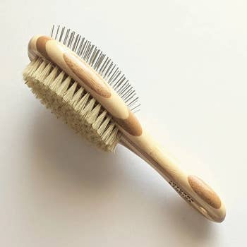 Our Bamboo Flexible Slicker Pet Brush is the perfect grooming tool for your furry friend. The Stainless Steel Pins gently remove tangles, loose fur, and debris. The head is flexible and will bend as you apply light pressure. One side has fine pins which are perfect for light tangles and knots. The other side has firm pins which help with matted hair. - Flexible and bendable - Bamboo Handle with Carnauba Wax Finish - Stainless Steel Pins - Natural Rubber Base - Gray Rubber Side: Fine Pins - Black Rubber Side: Firm Pins - Compostable Packaging The ergonomic design makes it easy for you to groom your pet.