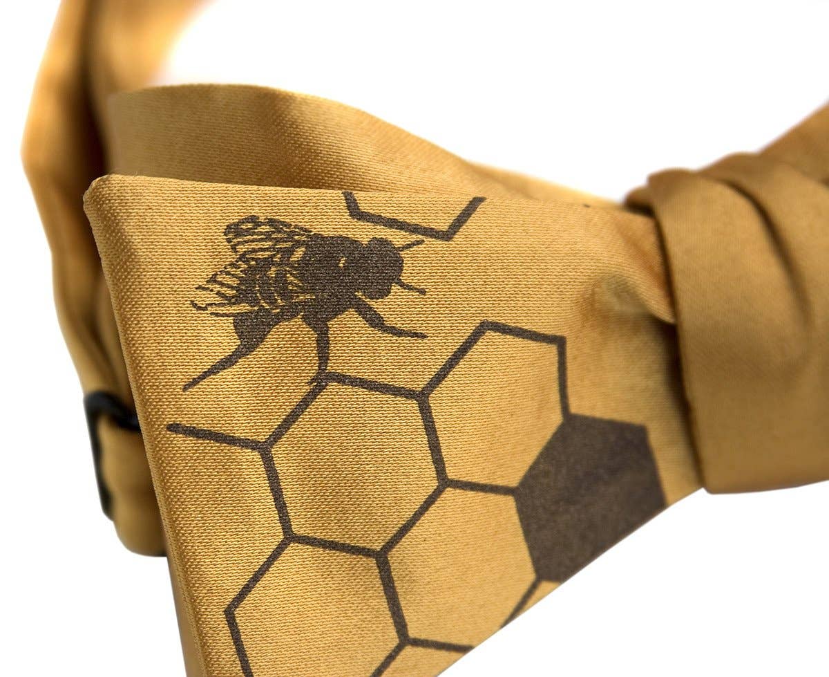 Honeycomb Necktie. Bee Hive "Oh Honey" microfiber tie. Honey bees and hive design. Got a Queen Bee in your life? They deserve a Bee Hive tie, its the bee's knees! • Pattern: Screen printed honeybee & hive. • Fabric: Silky-soft microfiber. • Printing ink: Non-toxic, waterbased ink. • Print size: ~12" from bottom point. • Tie Size: Choose standard, narrow, or XL.