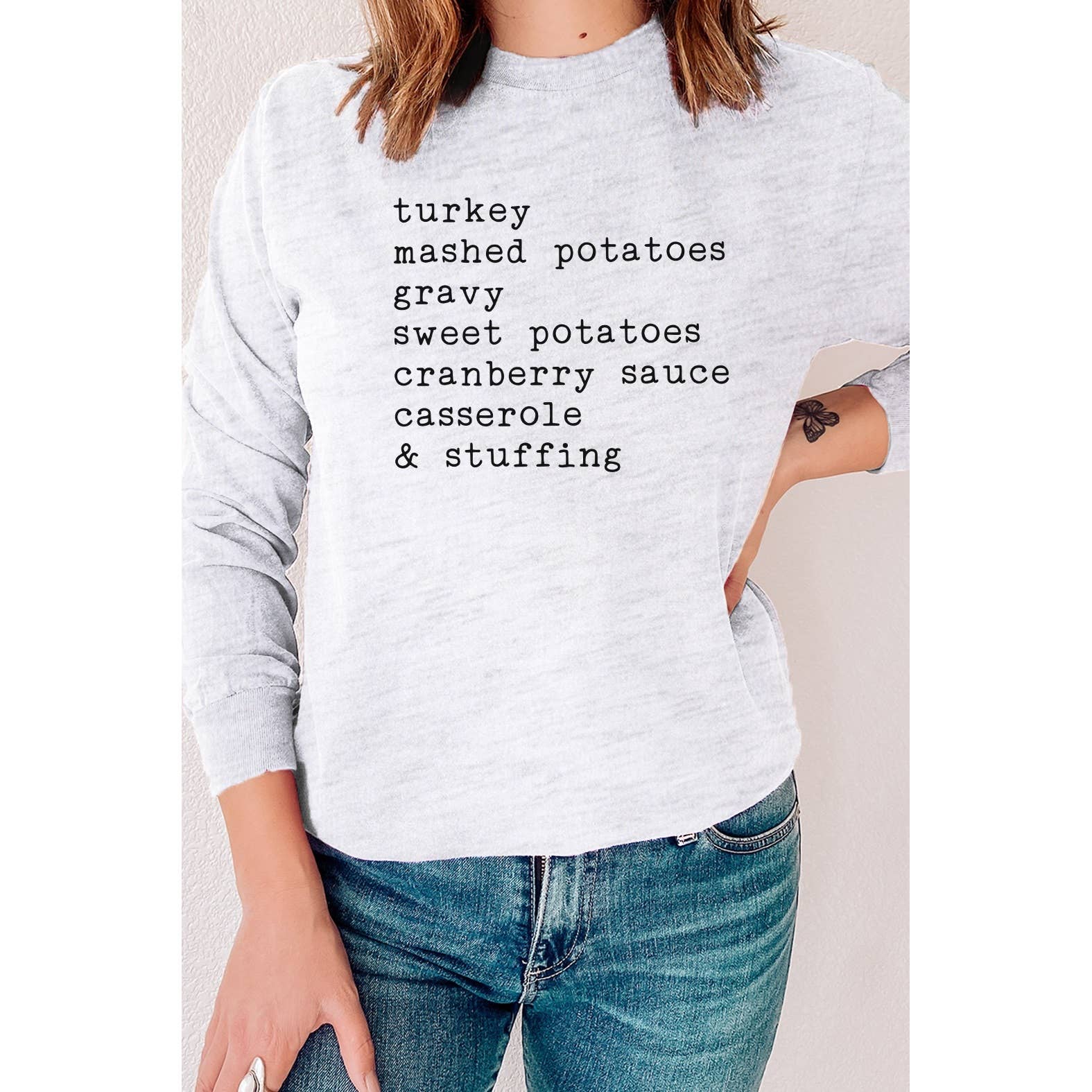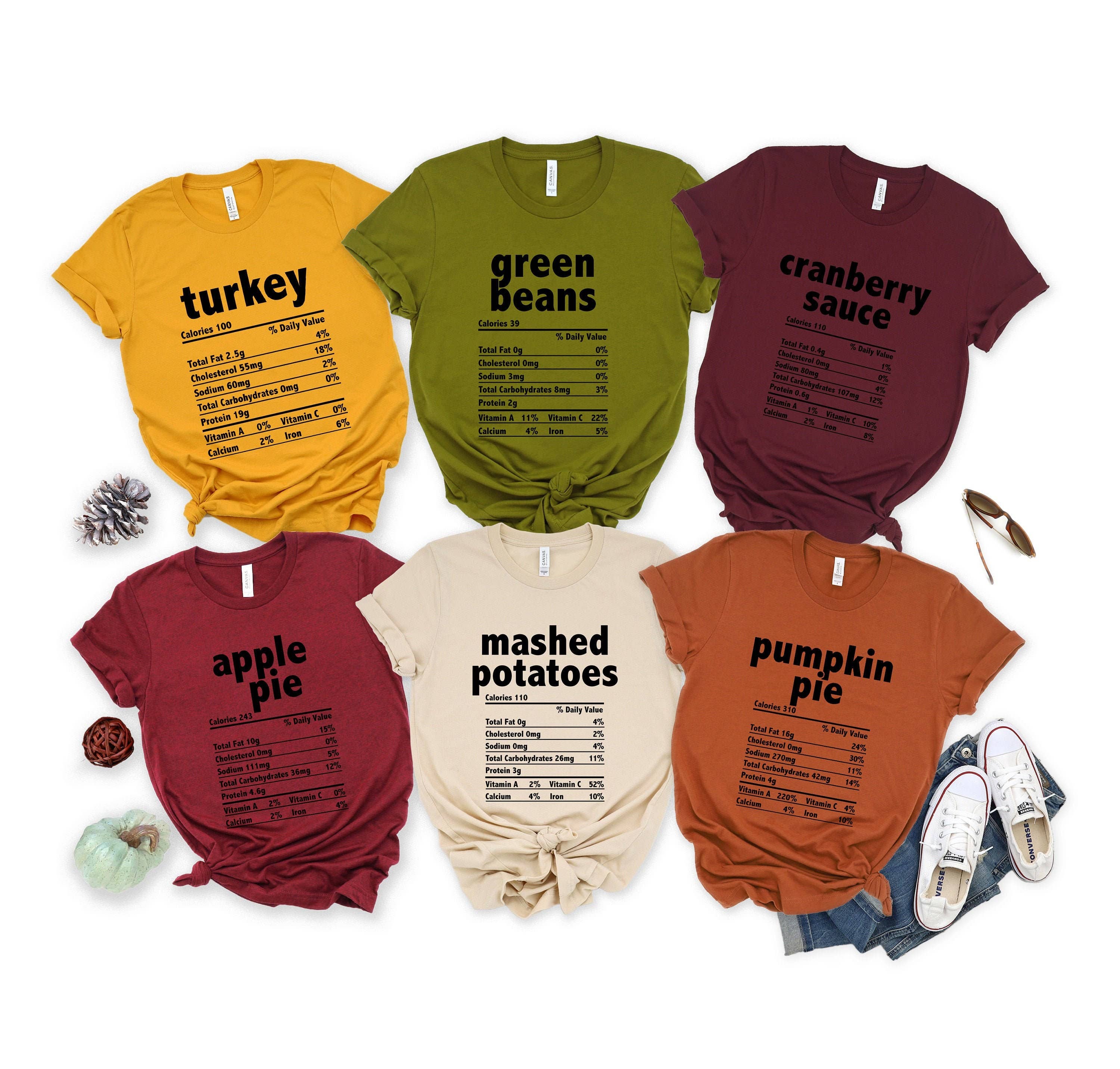 Grab one of these adorable Thanksgiving Food Tees! Size Guide: we recommend your true size for a loose fit or size down for a fitted fit. Tees are Unisex. Heather blend shirts are 52/48 Cotton/ Poly Blend and Shirts are Unisex. CREW NECK SIZING: * Small - Length, 28" Width, 18" (4/6) * Medium - Length, 29", Width, 20" (8/10) * Large - Length, 30", Width, 22" (12/14) * XLarge - Length, 31", Width, 24" (16/18) * 2XLarge- Length, 32", Width, 26" (20/22)  * We recommend comparing these measurements against a shirt that you like the fit of for ordering a tee that will fit best.