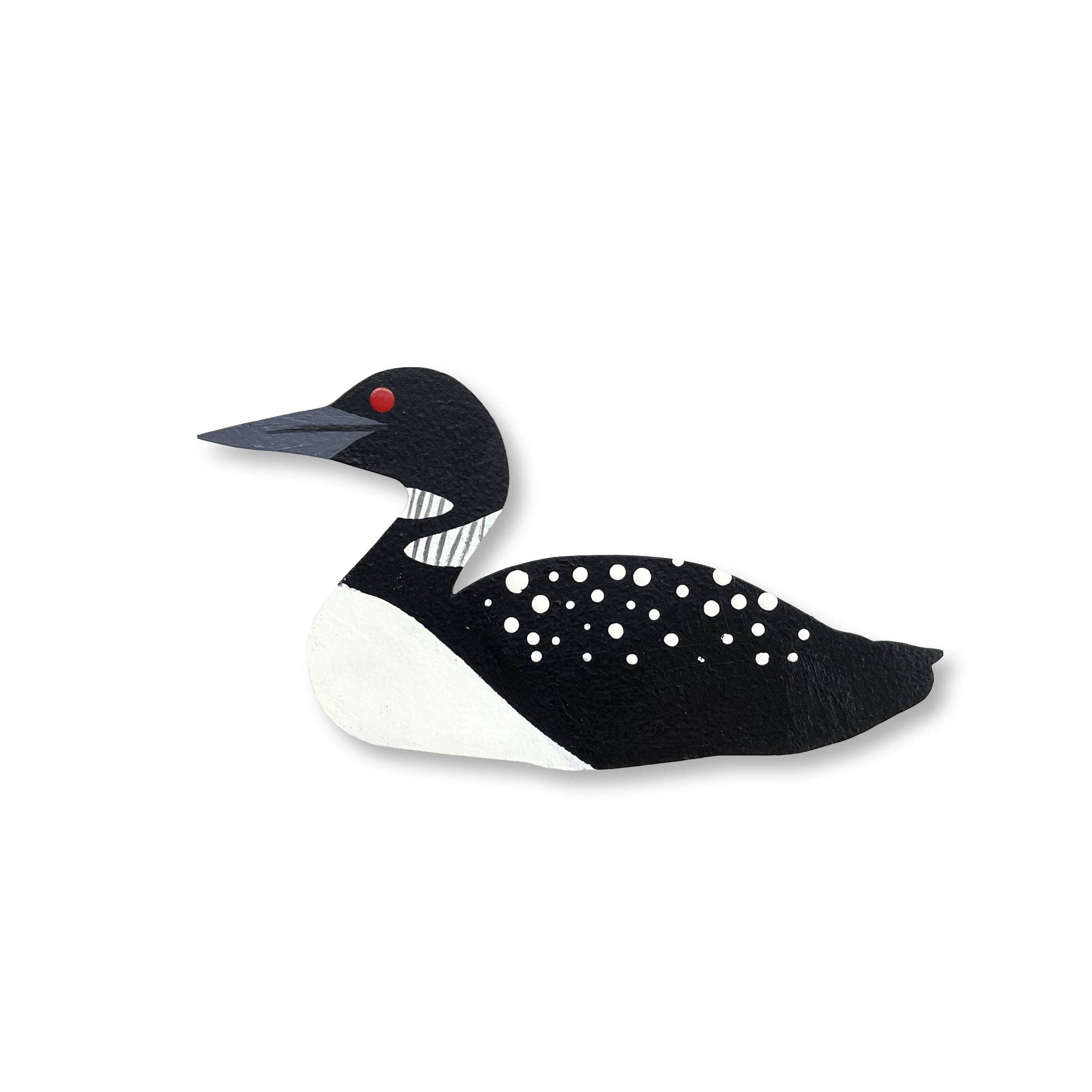 This little loon magnet brings joy wherever it goes. • Made of hand-painted 1/8" baltic birch plywood. • Super-strong rare earth magnet. • Magnet measures approximately 1.75" x 2.25". • Unpackaged