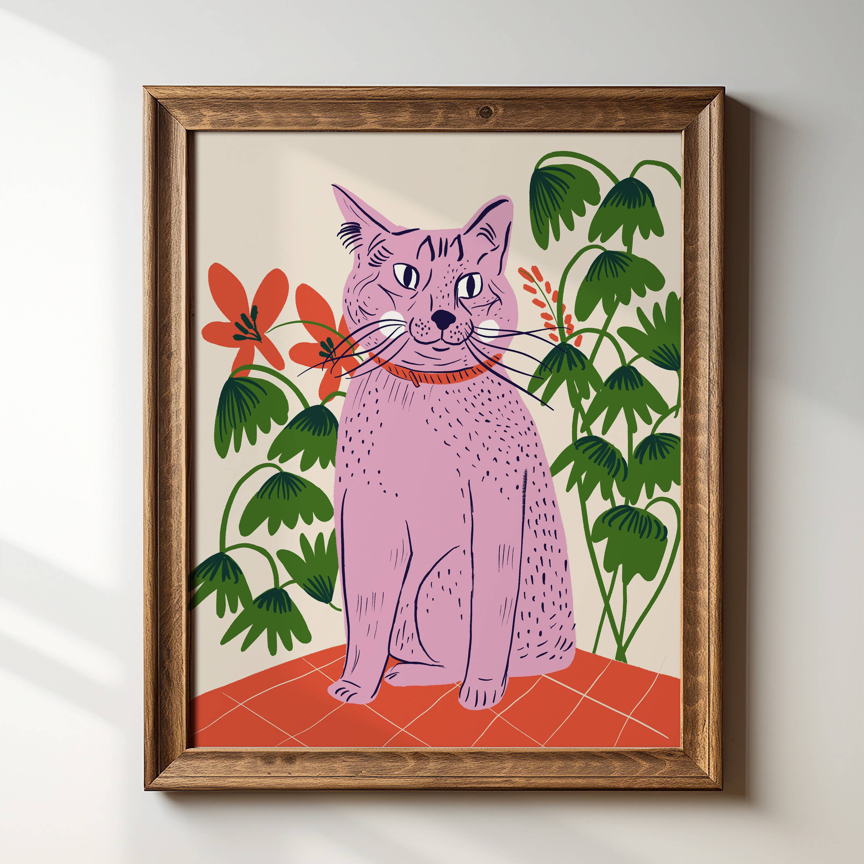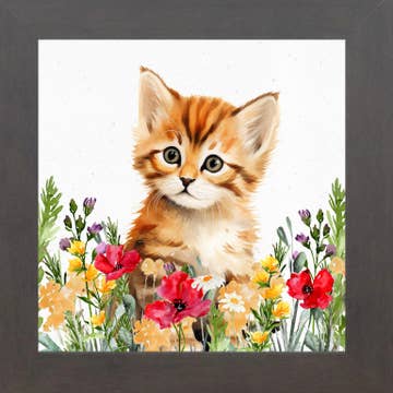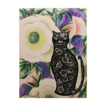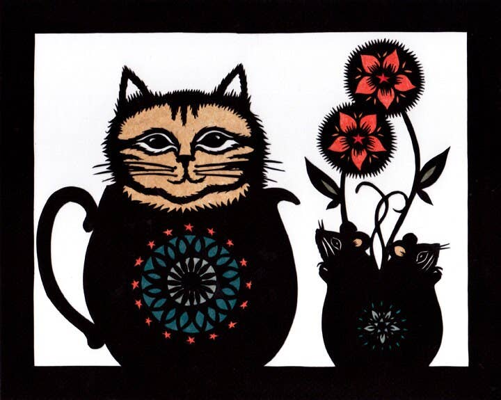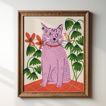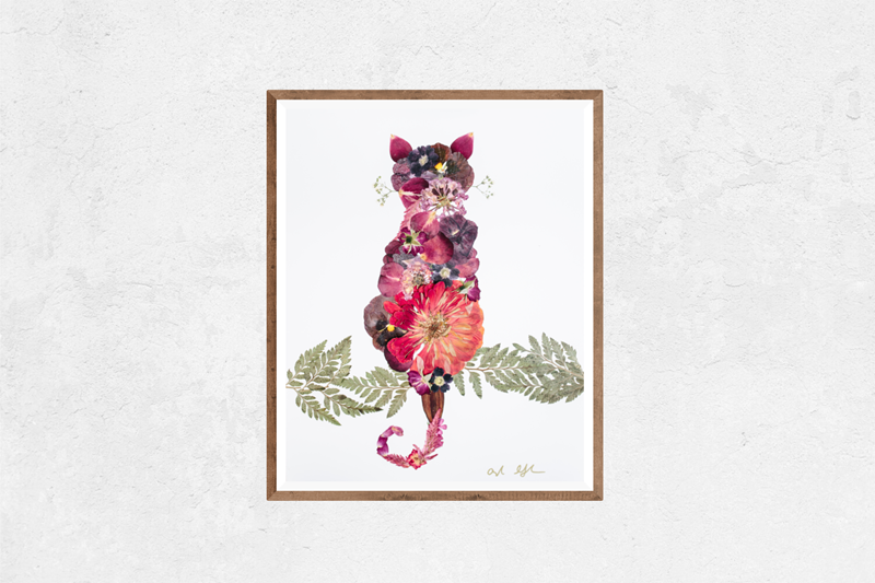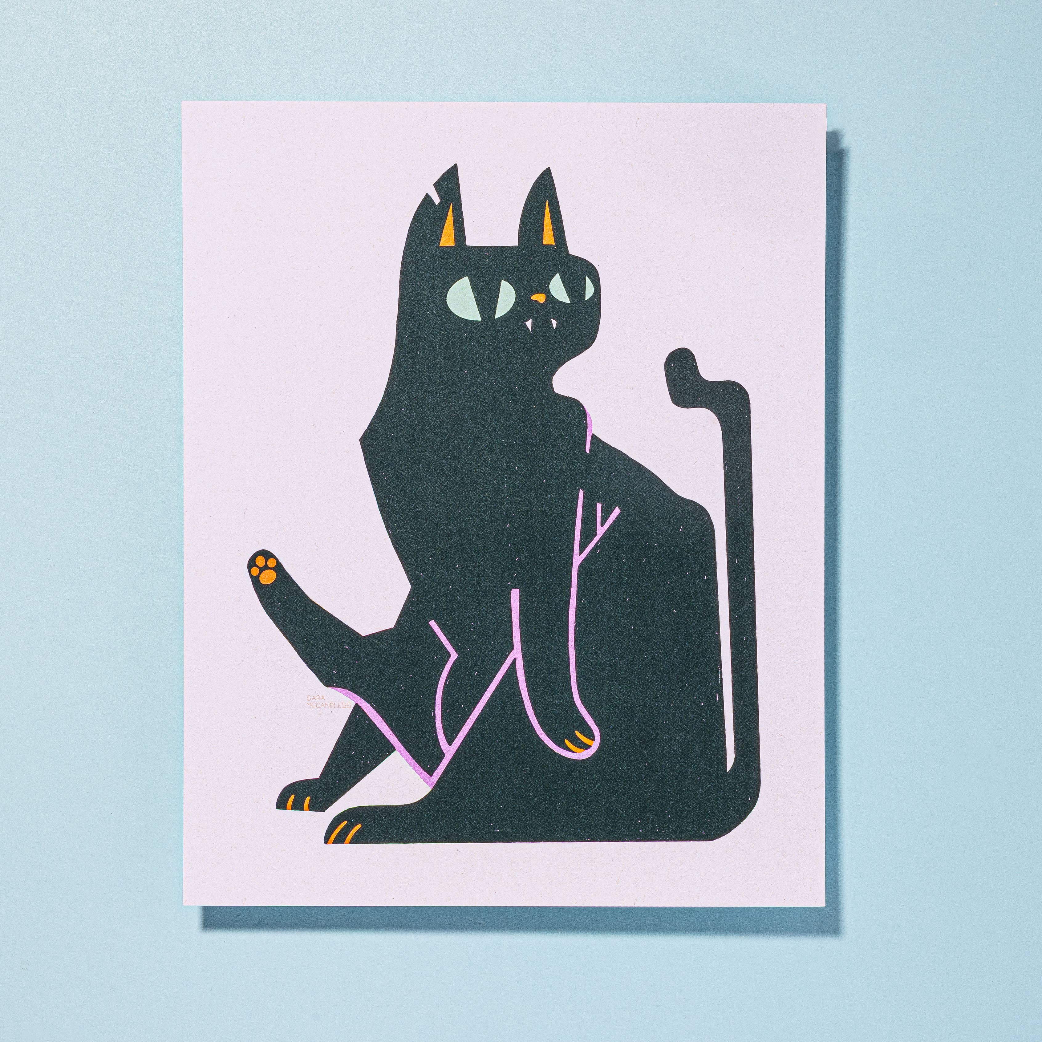 This sweet kitty with a clipped ear wears a ruff of yellow petals to blend into a flowery shrub. Risograph printed in seafoam, sunflower yellow, and black ink. - 11”x14” - Eco-friendly, vegetable-based ink - Printed on 100% recycled, FSC-certified fiber-fleck cardstock - Backing board and plastic sleeve