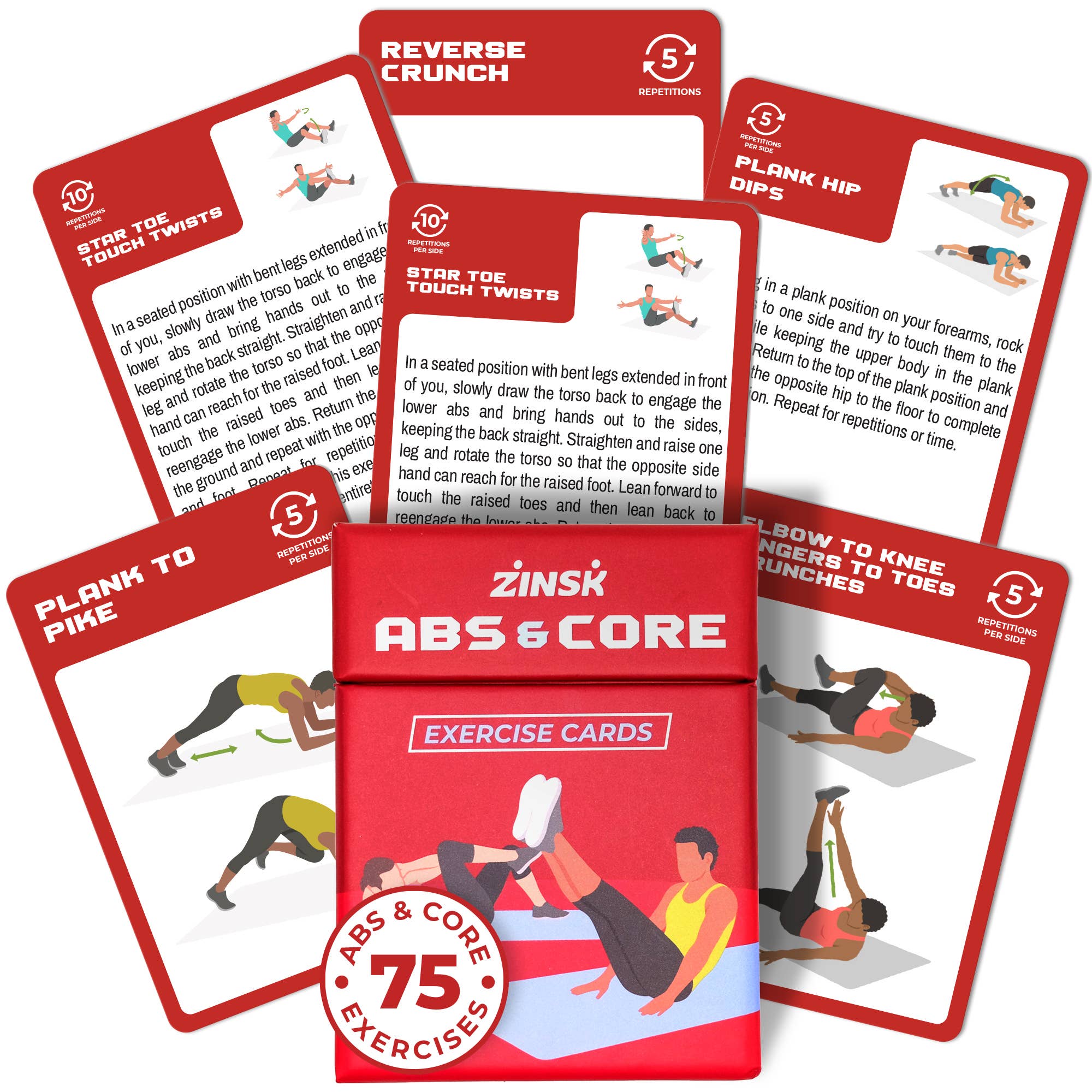 75 Bodyweight Exercises and Stretches that get you up and moving. This deck includes exercises that target all areas of the body and offers you a chance to be more active during your workday. Great for home or office use. These light, sweat-free exercises gently encourage you to build healthy habits where you are, no matter your fitness level, schedule, or environment. Sit less and move more. Quickly create custom workouts that fit any schedule. Simply draw a few cards to get started. This deck also contains premade 5, 10, and 15-minute routines and workouts for specific body parts so you can focus on what needs attention. Designed for all levels. Each card includes full illustrations, easy-to-follow step-by-step instructions, repetition and time information, and modifications and tips so that no matter your fitness level, you can still find regular movement throughout your day. Standard playing card size cards (3.5” x 2.5”)