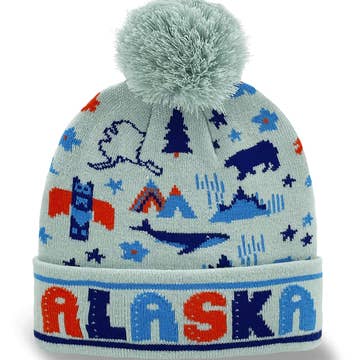 Alaska Knit Beanie with Bear, Whale, Mountains & State Icons