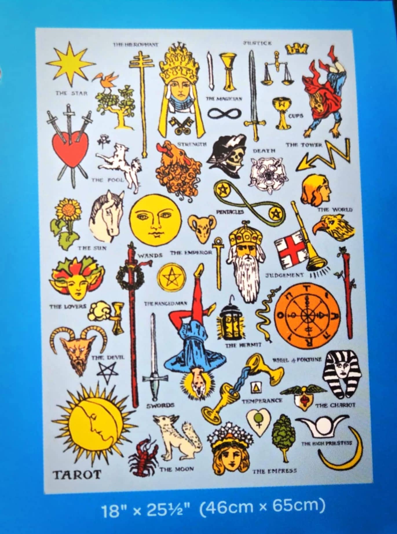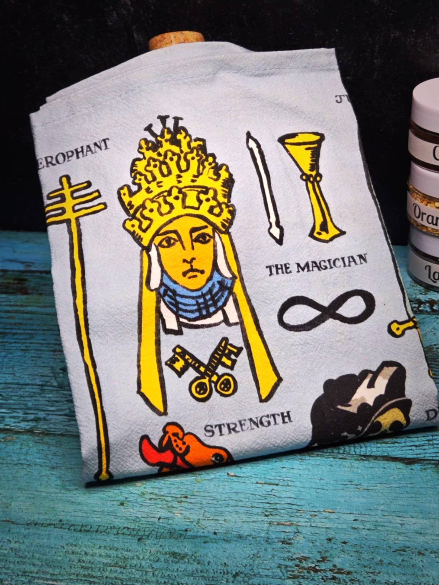 The entrancing Tarot dish towel features imagery from the Rider Waite tarot deck. Let it hang from the handle of your oven… or from your fridge… suspended in time… as you make a decision about dinner… Towel unfolded is 18 " x 25 1/2 " Hang loop, 100% cotton Timeless Keepsakes~ Trendy Kitsch~ We Have It All