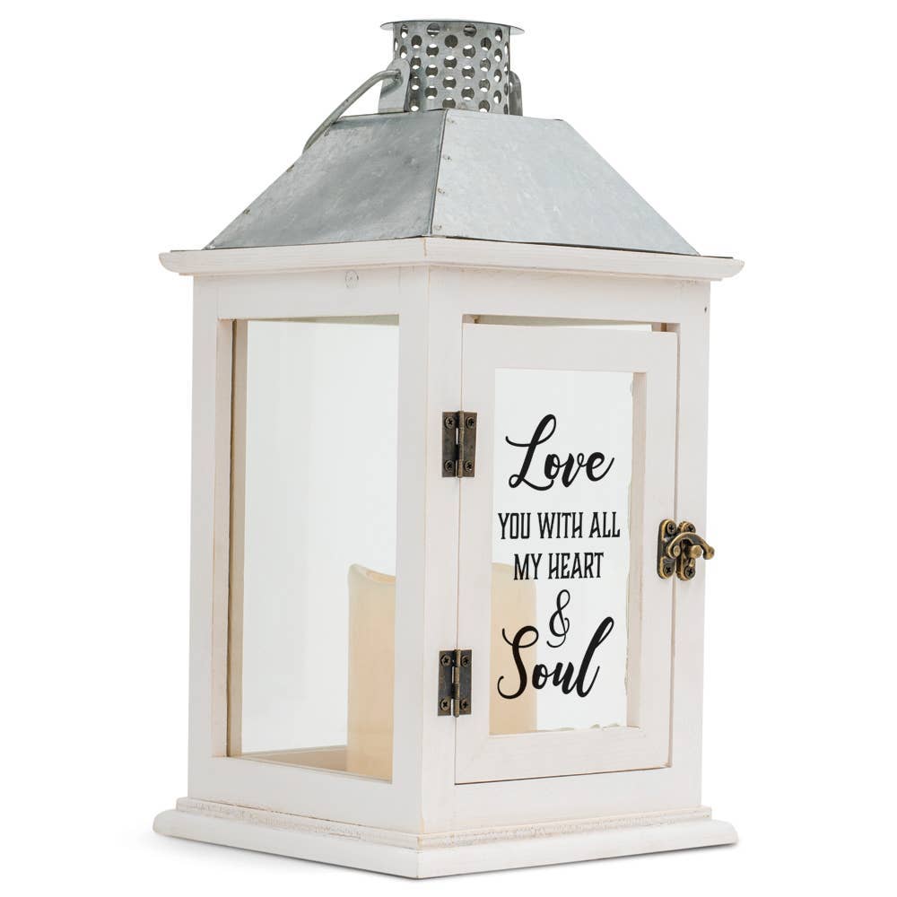 "You left me beautiful memories, your love is my guide, and though I cannot see you, you are always by my side." A comforting gift in times of bereavement, this attractive wood lantern is white with rustic distressed edges. A curved silver metal roof, industrial flute accent, and carrying handle are the finishing touches. Sides are clear glass all around, with sentiment on front door panel. Curved latch accents the piece while it holds the door securely. Lantern is illuminated from within by the soft flickering of a pillar style LED candle, included. Size of lantern is 12 1/4" high; 6.5" wide x 6.5" deep. Candle uses 3 AAA batteries, not included.
