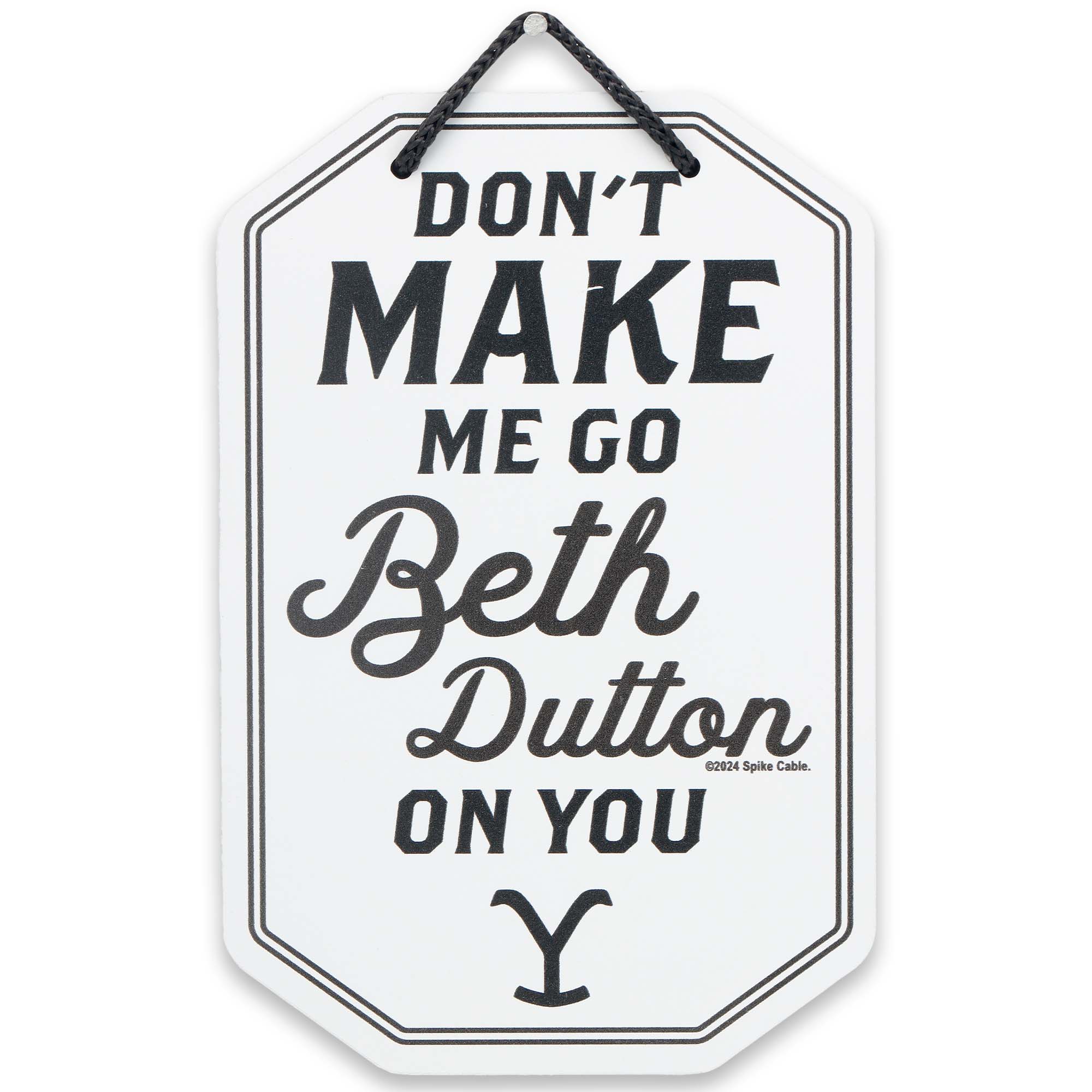 Yellowstone official product: Beth Dutton is known for her fearless and feisty attitude. Everyone knows not to mess with her! Let everyone know you have a wild side of your own with this humorous wall art. Fun Vintage Sign: Western-style typography reads, "Don't make me go Beth Dutton on you," and the Yellowstone brand completes the look. It's truly a must-have for any Yellowstone fan! Material: This striking wall decor is made of MDF, a lasting and sturdy material. With the included hanging hardware, it's easy and quick to hang this sign on your wall. Made in the USA. Places to Use: Display this recognizable tribute to the hit TV show in your living room, bedroom, or office. Size: 9.8" W X 14.7" H X 0.375" D