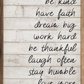Two things that are a great way to live by. Work hard and just be nice to people. We are loving this fun and cute way to remember that. This would make a great piece to hang in your kitchen or dining room for a daily reminder to start your day. • Printed on cotton canvas mounted on wood • Rustic aged oak solid hardwood frame • Fully assembled and ready to hang • 12x18" installed sawtooth & hanging twine • 18x24" installed sawtooth hardware • Signs may have +/- 1" size variations • Sustainably sourced American oak wood • Made in the USA in our Utah studio