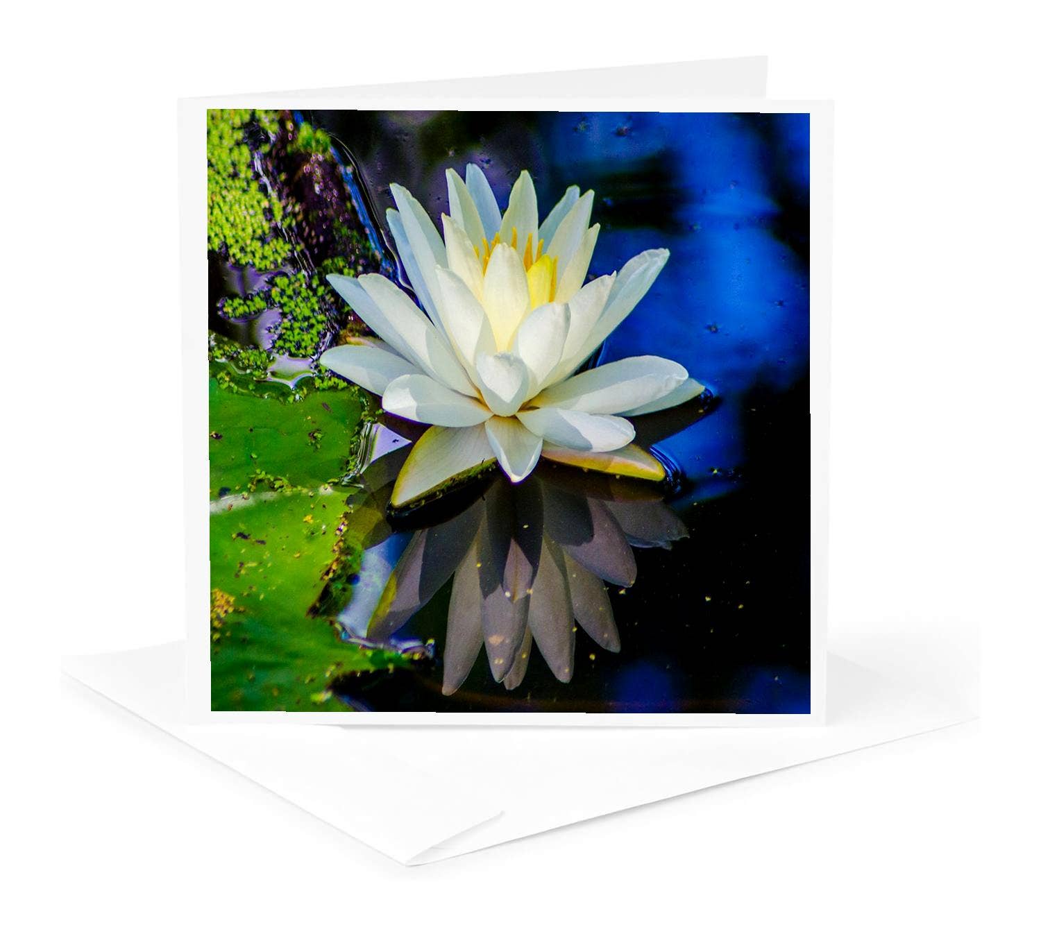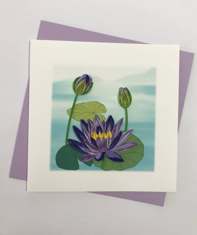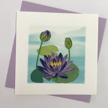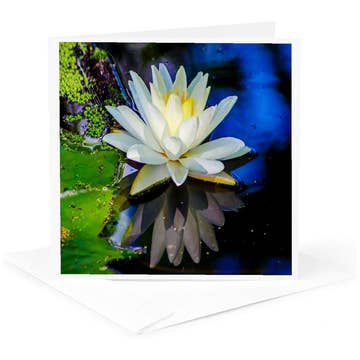After the Decorative Designers Studio 1900 USA. Letterpress printed. Deckle edged paper. Includes matching envelope. Available sleeved or unsleeved. Elegant white water lilies floating on turquoise water in sophisticated Arts & Crafts design. Precise letterpress captures delicate petals and water reflections on heavy textured paper with deckle edges. Water lily symbolism (peace, purity, rebirth) works for sympathy, congratulations, thank you, and thinking of you occasions.