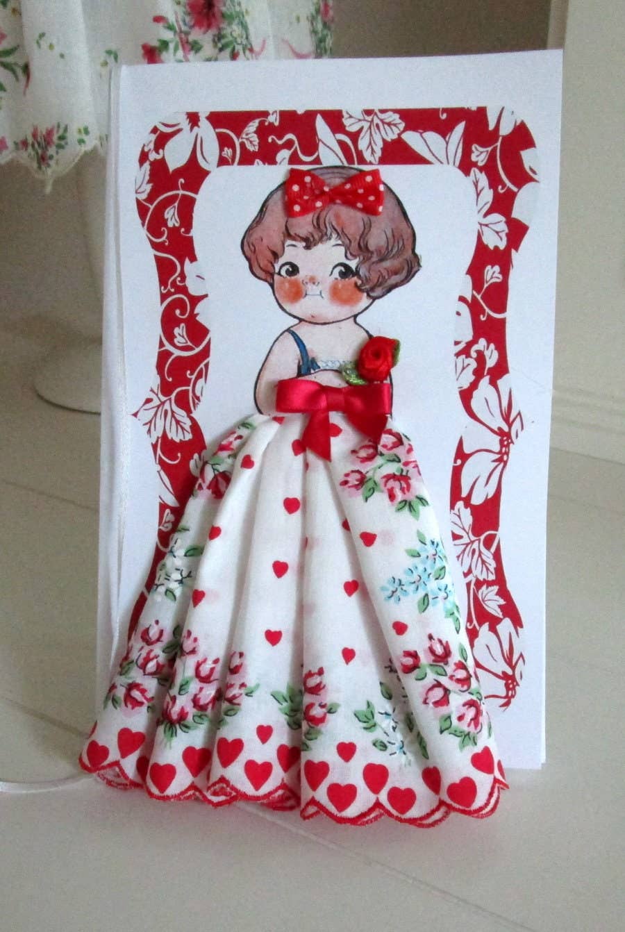 This beautiful card is 5" 8 is offered in a clear sleeve. An envelope is also included. To My Valentine, Love's Fondest Wishes. Handkerchief included.