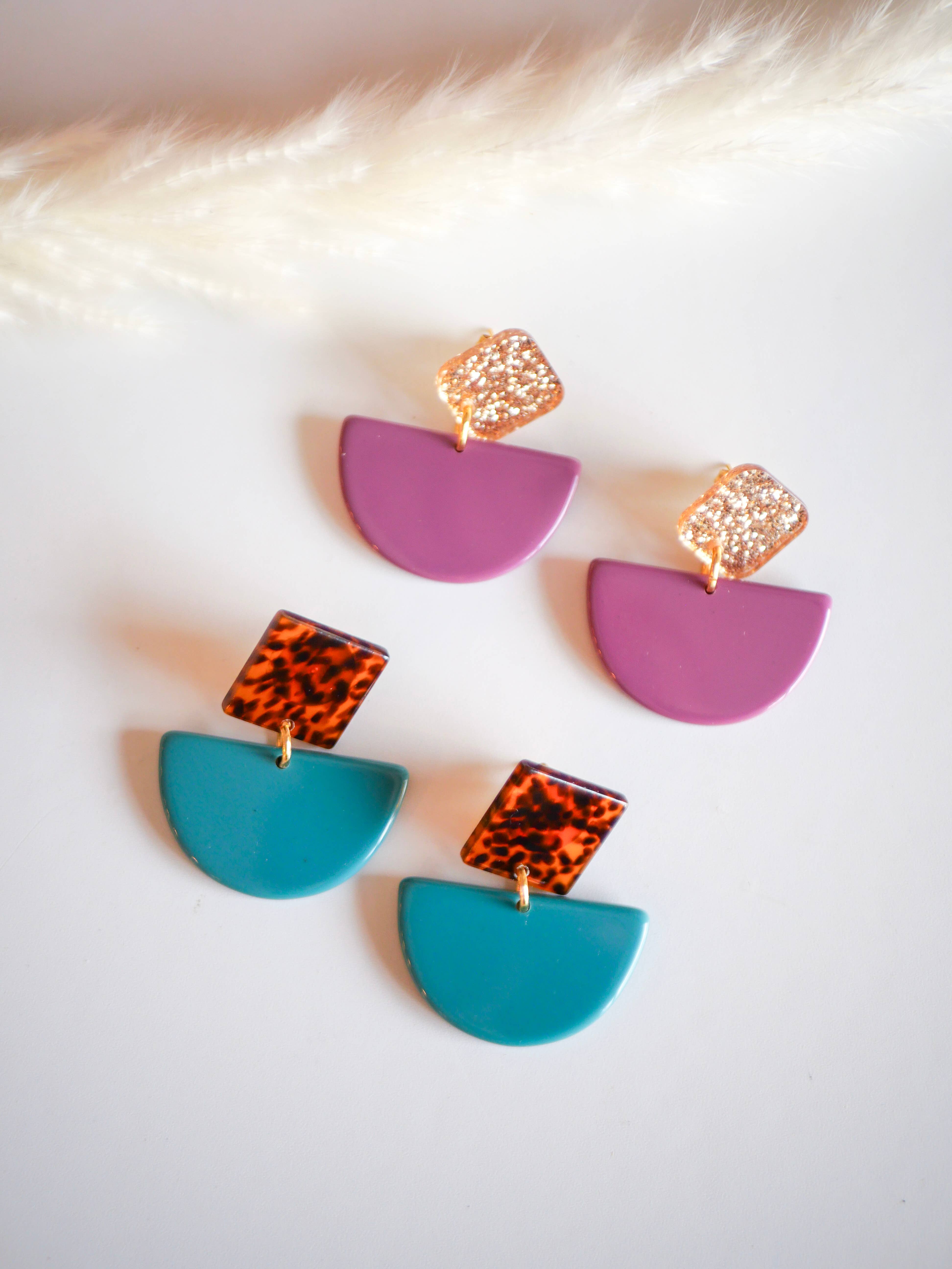 Stainless steel hook & resin buckle Weight: 5g Size: 6.5 x 4 cm Clasp: Stud (gold or brown) Clip (brown) All jewelry is designed, made, and assembled at my home, in my workshop in Nancy. The real advantage of Azeria jewelry is their lightness. They are very comfortable to wear every day.