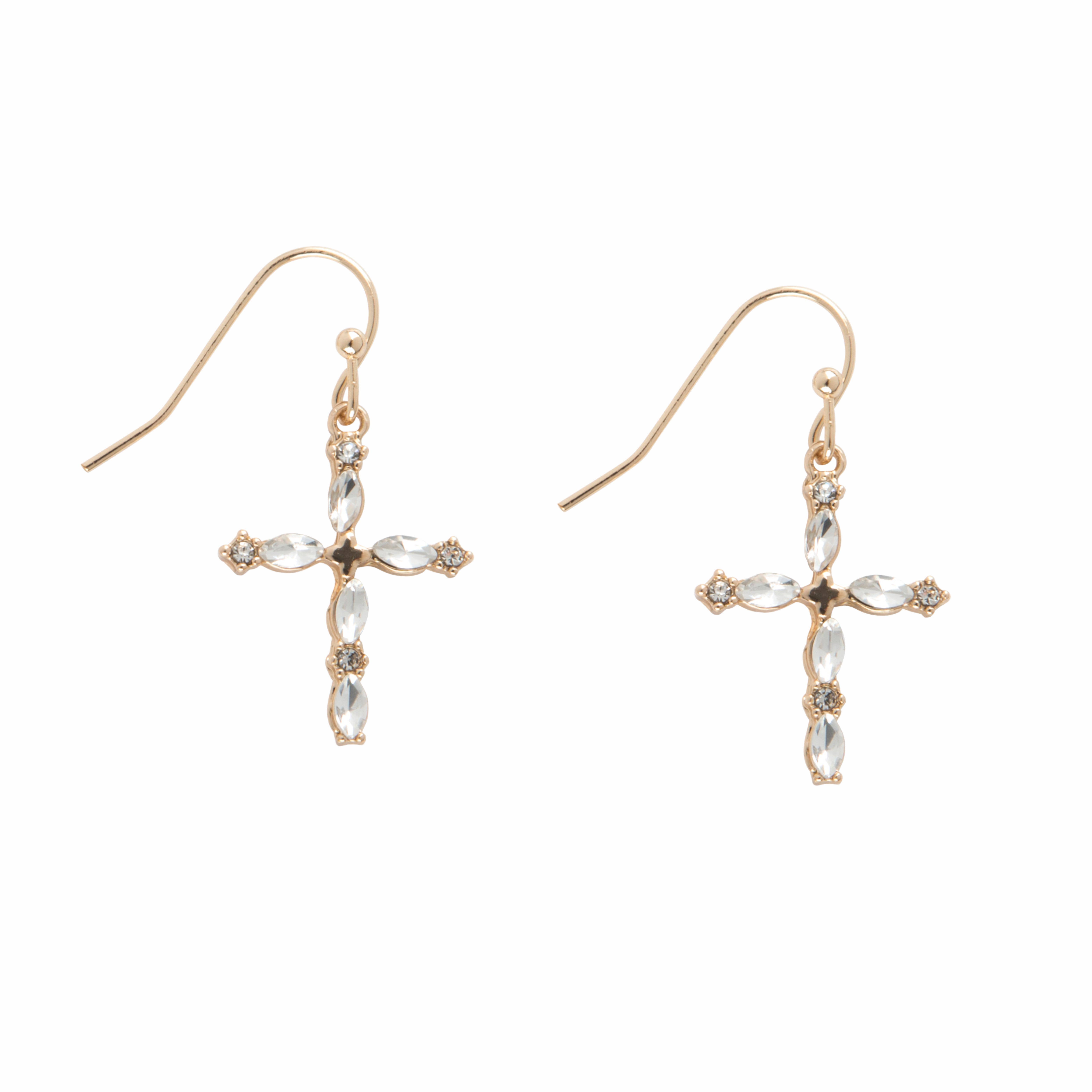 Silver Metal and Clear Rhinestone Huggie Style Stud Earrings Featuring Filigree Cross Drop Detail with Clear Crystal Rhinestones. Earrings measure 1.5 inches wide.