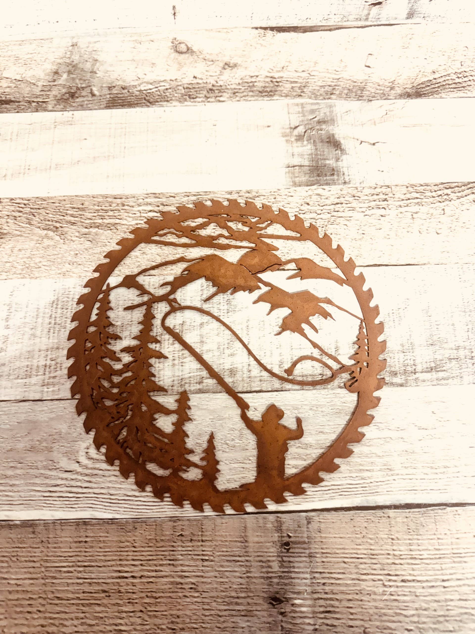 The Recherche Furnishings Rustic Metal Hand Saws are all created and rusted in Texas. The handle is solid wood and stained dark walnut. Each Saw will look slightly different due to the nature of metal, rust, and wood. ACTUAL SAW: 6" wide and 28.25" long. WITH STAND, 32" tall. Stand is made of solid steel and painted matte black. Made in USA. Perfect for any Home Decor, Gift, Western, or Furniture Stores.
