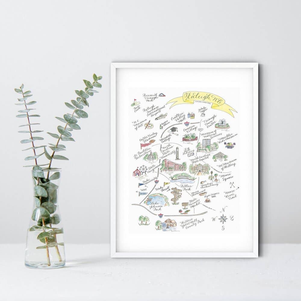 This is a matted hand-calligraphed and illustrated print of Chapel Hill, NC. The mat color is mid-gray as shown in the second photo. This print is sold unframed. Overall size (including mat) is 11 x 14 and is packaged with a white backer board in a plastic sleeve. All printing is done locally and all paper and packaging is made in the USA. All papers and packaging are now earth-friendly!