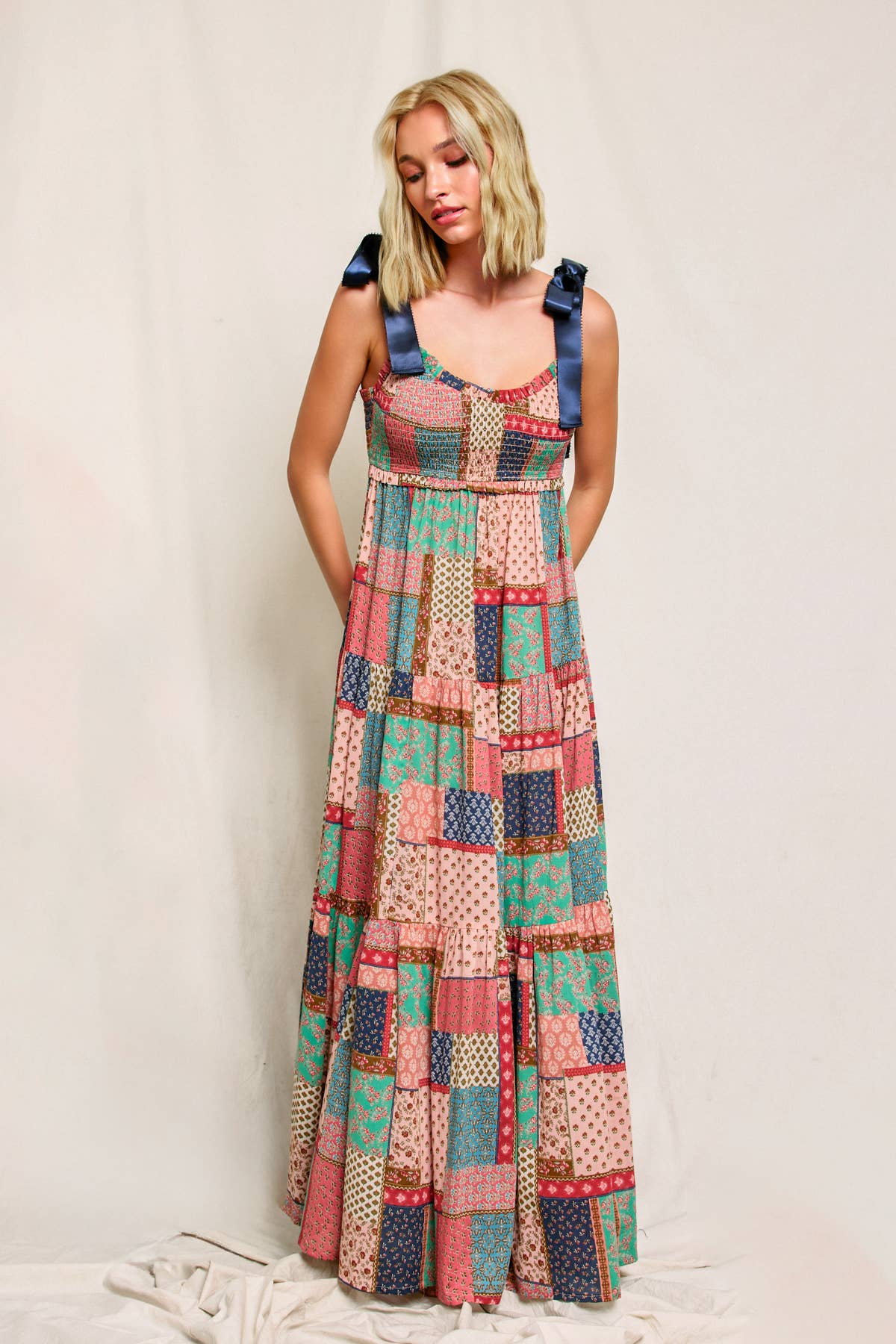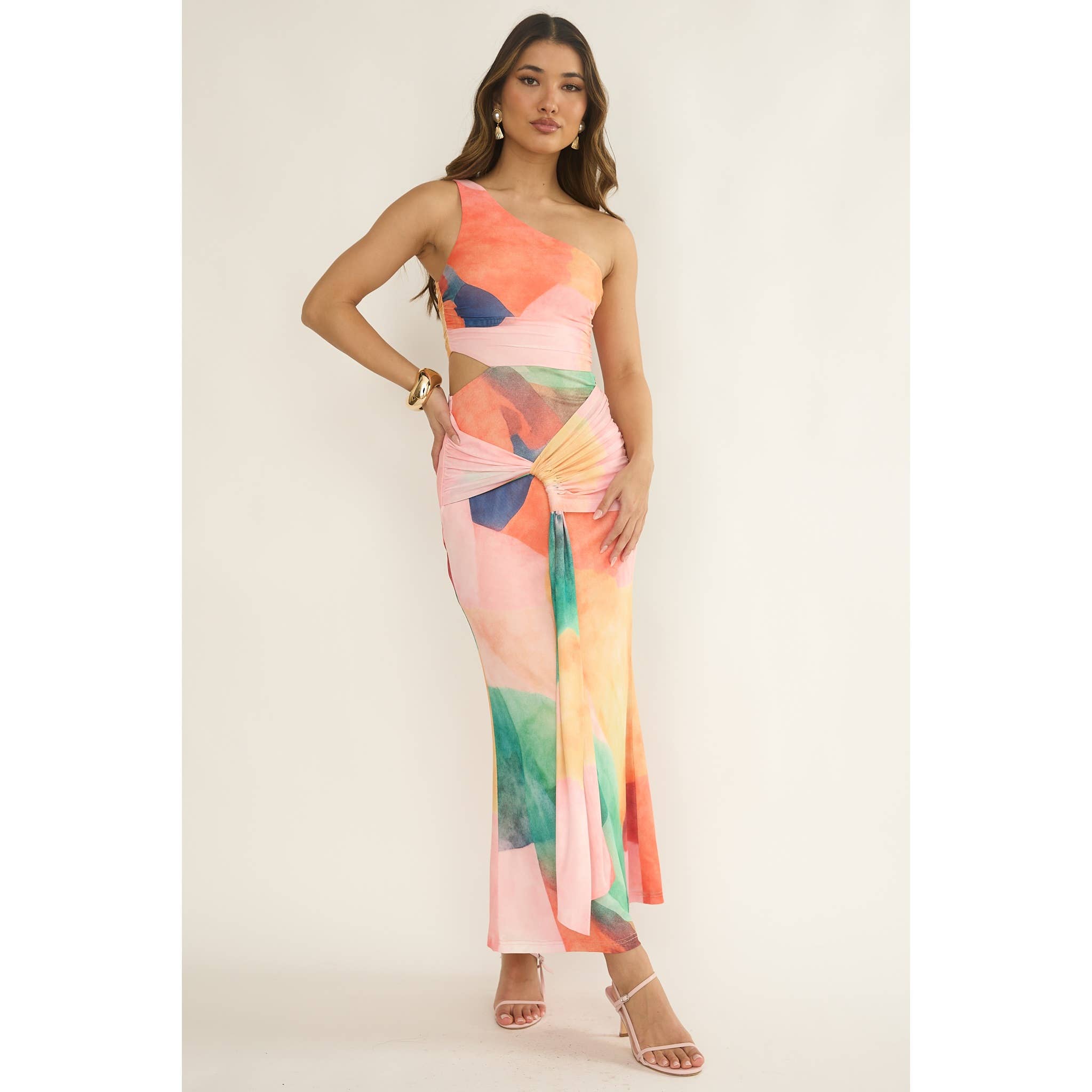 - Style No: DM3399P-3 CUT OUT BACK WAIST BUTTON DOWN COLLAR MAXI DRESS 95%POLYESTER, 5%SPAN Our lovely Monique is US size 2 with the following measurements: height:5'8" bust:34 C waist:26 hips:34 She wears size Small. MACHINE WASH COLD WITH SIMILAR COLOR