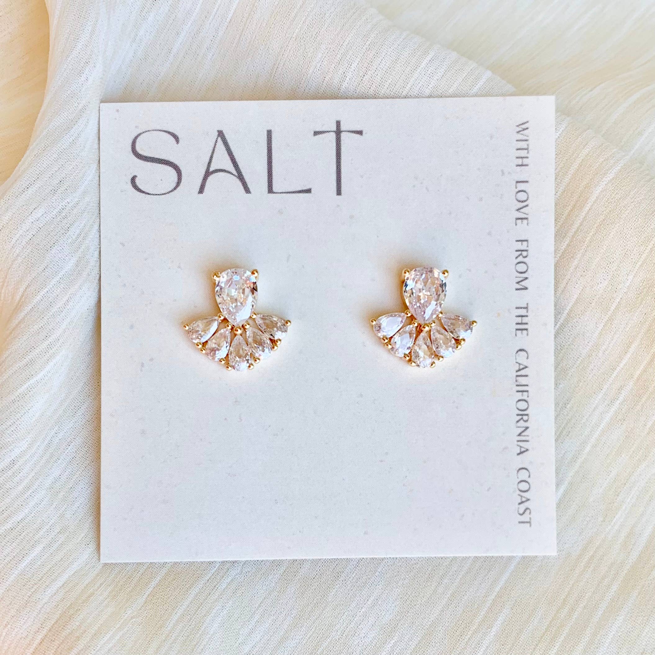 CUBIC ZIRCONIA DIAMOND EARRINGS Stunning showstoppers that don't break the bank! These swanky fan-shape earrings are a lovely balance of boldness & elegance. They look and feel luxurious, making an ideal gift for yourself or others! SAFE FOR SENSITIVE SKIN -Free of nickel, lead, & metals that irritate the skin. -Will not turn skin green. -Not heavy on the ears. ANTI-TARNISH 18K GOLD COATED -Base metal: brass - coated with real 18k gold. -Our gold layers are wonderfully thick. -Very tarnish-resistant & durable for long term wear. -Silicone stud backings for a secure, discreet look. SIZE (forward facing) ~.55" x .60" CASE OF 1 You will receive 1 pair of earrings with each case you purchase. PACKAGING Each pair arrives on a branded SALT square card. Easy to display in your shop!