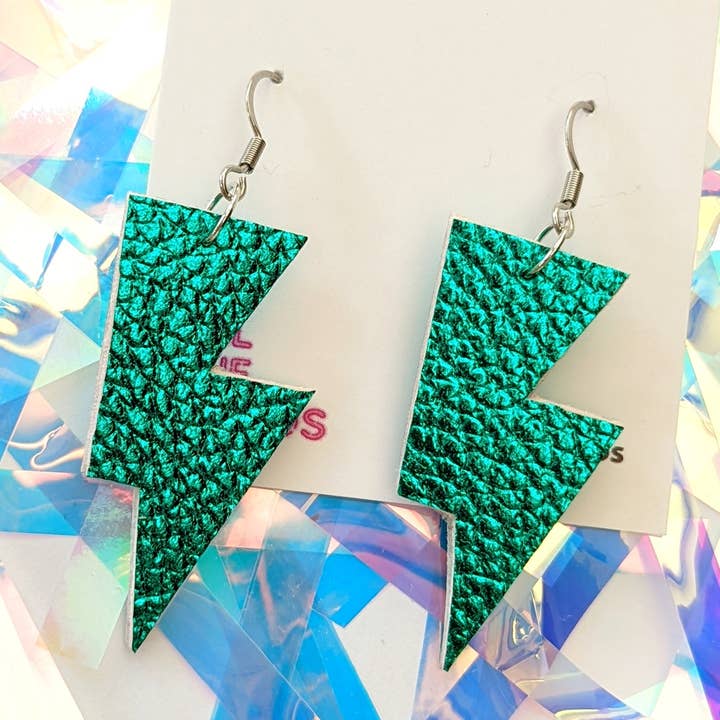 These mini versions of our best selling 'Disco Bolts' are perfect for a little hint of sparkle or colour. Requested lots as a perfect 'day' option to the larger sizes 'night' they complete our lightning bolt family. Handmade from a sparkly chunky glitter canvas fabric. An amazing purple glitter base sprinkled with a rainbow of bright glitter, making this pair the perfect partner to almost any outfit, a great gifting option and an absolute best seller! Each earring is hand cut, double sided and available with stainless steel pierced dangle earring hooks. They measure approximately 4cm long (measurements are per earring)