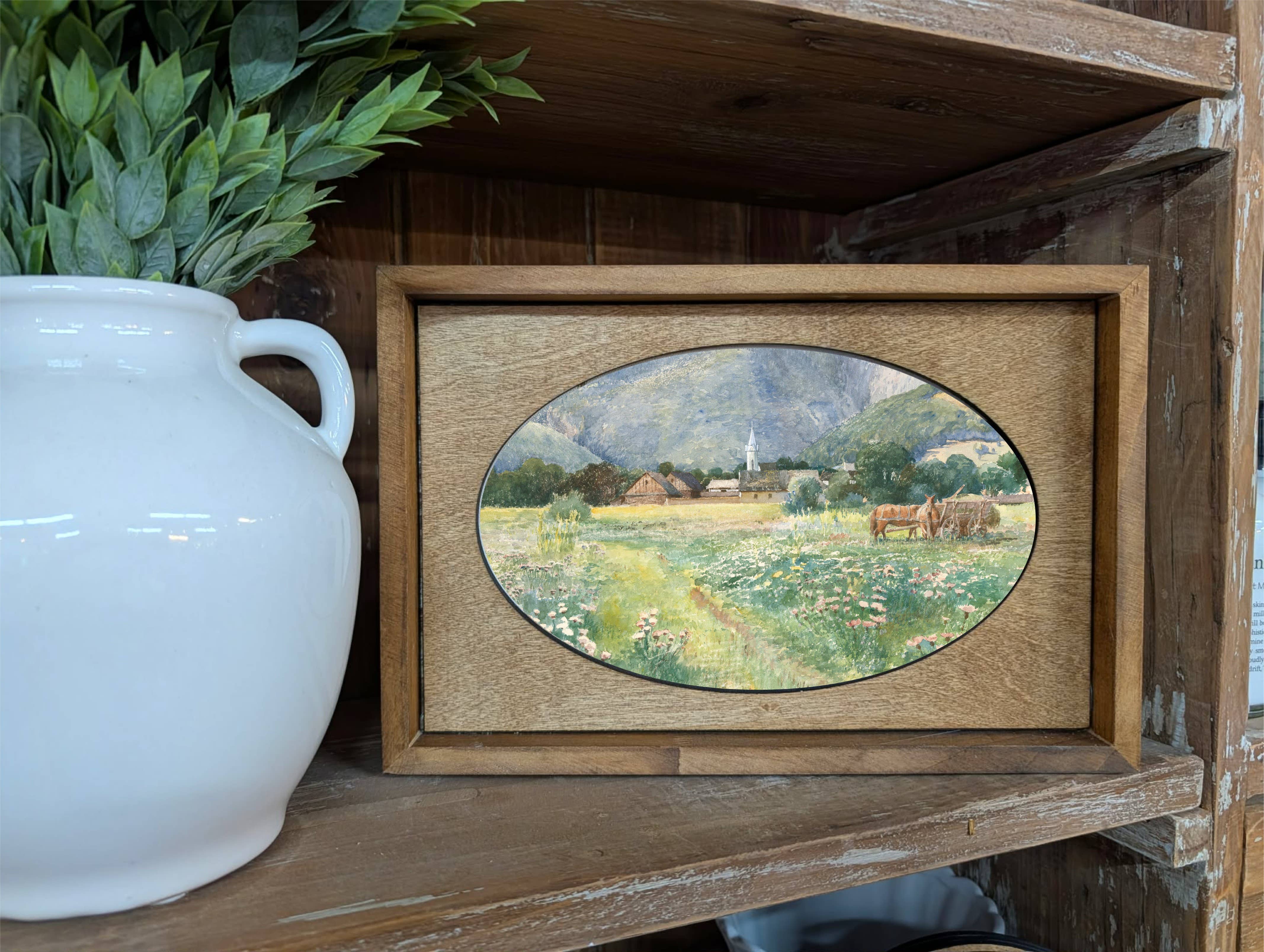 This unique piece is a simple way to bring beauty and charm to any wall or shelf within the home. It is made from high quality American hardwood planks with a hand painted face, and printed with UV cured ink, and is framed in a natural walnut frame. Each piece is unique with its own personality, marks, wood grain, and look. Easy to clean with a dry cloth.