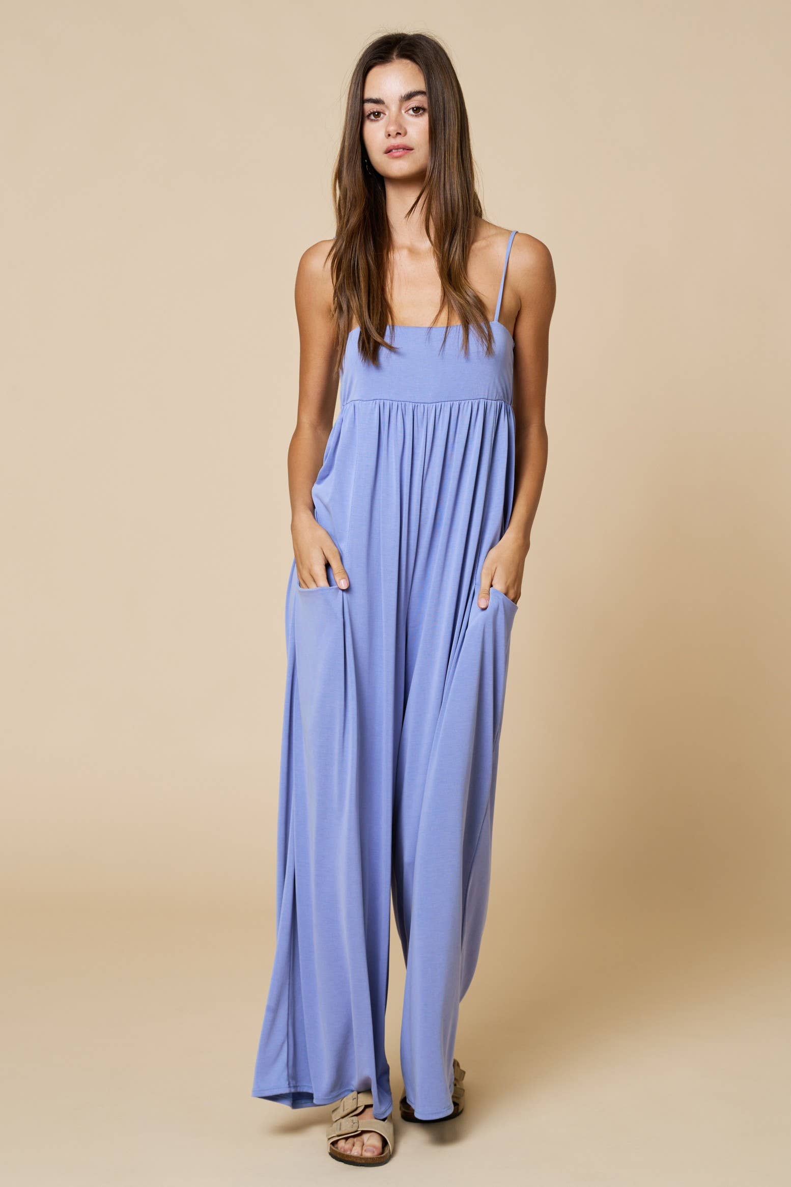 Solid button sling wide-leg overalls jumpsuit with pockets. Also available in sizes S to L: Style no. IP15295. Full Length: 54 1/2", Content: 90% Polyester, 10% Spandex. Body Size: Plus. Made in Country: Imported.