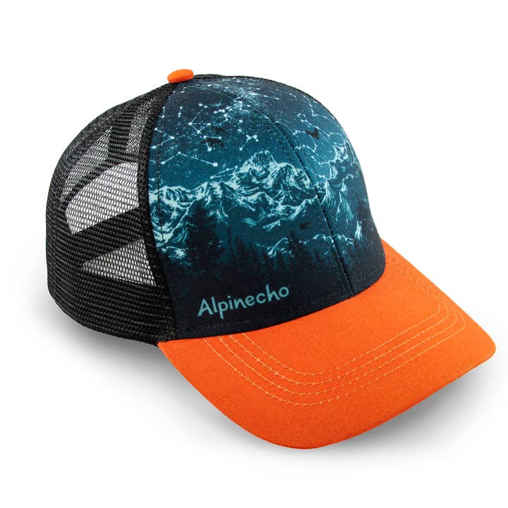 Hand-drawn mountain layers recede into the distance behind a lake. Inspired by many sunsets sitting next to mountain lakes. ITEM DETAILS Alpinecho's trucker hats are made in partnership with Purnaa, a social enterprise and World Fair Trade Organization Guaranteed Member (WFTO) in Nepal with a mission to create jobs that empower marginalized people to fresh starts and fulfilled lives. At Purnaa, staff receive technical skills training, life-skills training, access to counseling, healthcare, and employer-matched savings in a positive work environment. For more information on how these hats are made and who makes them, see the hat page on our website. * Full-color, mid-profile front, black mesh back with snap back * One size fits most * 100% recycled polyester Made sustainably and ethically in Nepal by Purnaa.