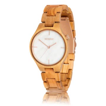 As there is always time for coffee, now here is coffee for time. Coffee lovers and barista's, this one is for you! HOT&TOT launches a brand new concept in the watch business: A watch made from COFFEE BEANS! See, touch and SMELL the coffee beans on your wrist, with the brand new HOT&TOT ROAST. Made from real roasted coffee beans. With a jute colored canvas strap. The creamy colored dial with it's black and rosegold details looks just like a cappuccino. This is THE perfect watch and/or gift for anyone who is fond of drinking coffee (and who isn't?). Do you own a coffee shop, restaurant, giftstore or clothing store? The HOT&TOT Roast is the perfect product for your store. Great quality, great story, and above all, a completely unique product to offer to your customers. Includes a beautiful coffee styled giftbox. For who: unisex Case diameter: 40mm Dial color: creamy white Color: Coffee bean brown / gold Case material: Coffee beans and epoxy Strap: Jute colored canvas