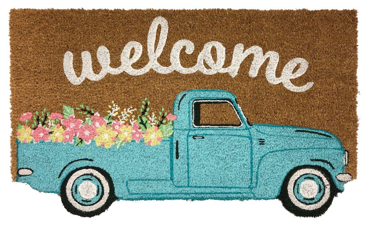 Add a nostalgic touch to your doorstep with our Fresh Flowers Doormat. This charming mat features a vintage-inspired blue truck, its bed brimming with colorful fresh flowers. Capturing the essence of rustic charm and countryside allure, this doormat brings a delightful pop of color and character to your entryway. Each step onto this whimsical mat transports visitors to a simpler time, making it a cheerful and inviting addition to any home. Made of natural coir, a dense fiber that is naturally mold and mildew resistant. Coir is a renewable resource that is durable and coarse, excellent for scraping shoes clean. Vinyl backed for increased durability and to help prevent movement, coir doormats are weather tolerant absorb moisture and retain their shape. For best results keep in a sheltered area such as a covered porch, keeping extreme moisture and sunlight to a minimum. Vacuum, sweep or lightly hose clean. 70% coir, 30% vinyl.