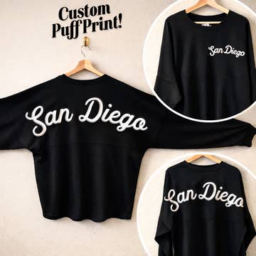 HOW TO ORDER: In the Personalization/Notes Section at checkout state the text exactly as you would like it printed + Puff Print Color + Glitter Print Color Example: San Diego, Black Puff Print, Gold Glitter Now with Embossed Print and a glitter outline! Make your idea POP even more. Customized Puff Print "Your Small Business, Shop, Boutique or City" Custom Cropped Sweatshirts The print is embossed and raised from the garment with an outline in glitter print, for an ultra high quality feel! Soft and comfortable, these custom small business cropped sweatshirts are true to size and more on the longer side than short crop length. Sizes Available: S, M, L, XL, XXL Sweatshirt Colors: White, Black, Natural, Navy Blue, Forest Green, Red, Soft Pink, Baby Blue, Green, Gray, Hot Pink Puff Print Colors: White, Black, Red, Natural, Pink, Green Glitter Print Colors: Gold, Silver, Pink, Green, Black, White, Navy Blue * Please note that the embossed part of the print may be textured