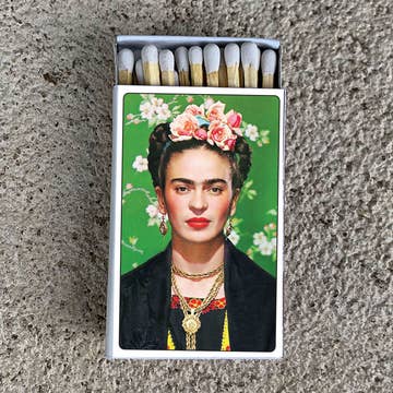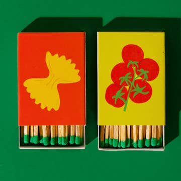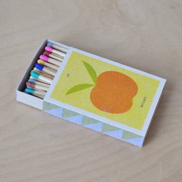 50 multi-colored 3” matches packaged in a 2¼ x 3¼ x ½” matchbox with riso printed sliding sleeve. Made with heavy-weight cardstock. Striker strip on the back of each box. 50 matches measured by weight. Sleeves designed, printed, and assembled at Sunroom.