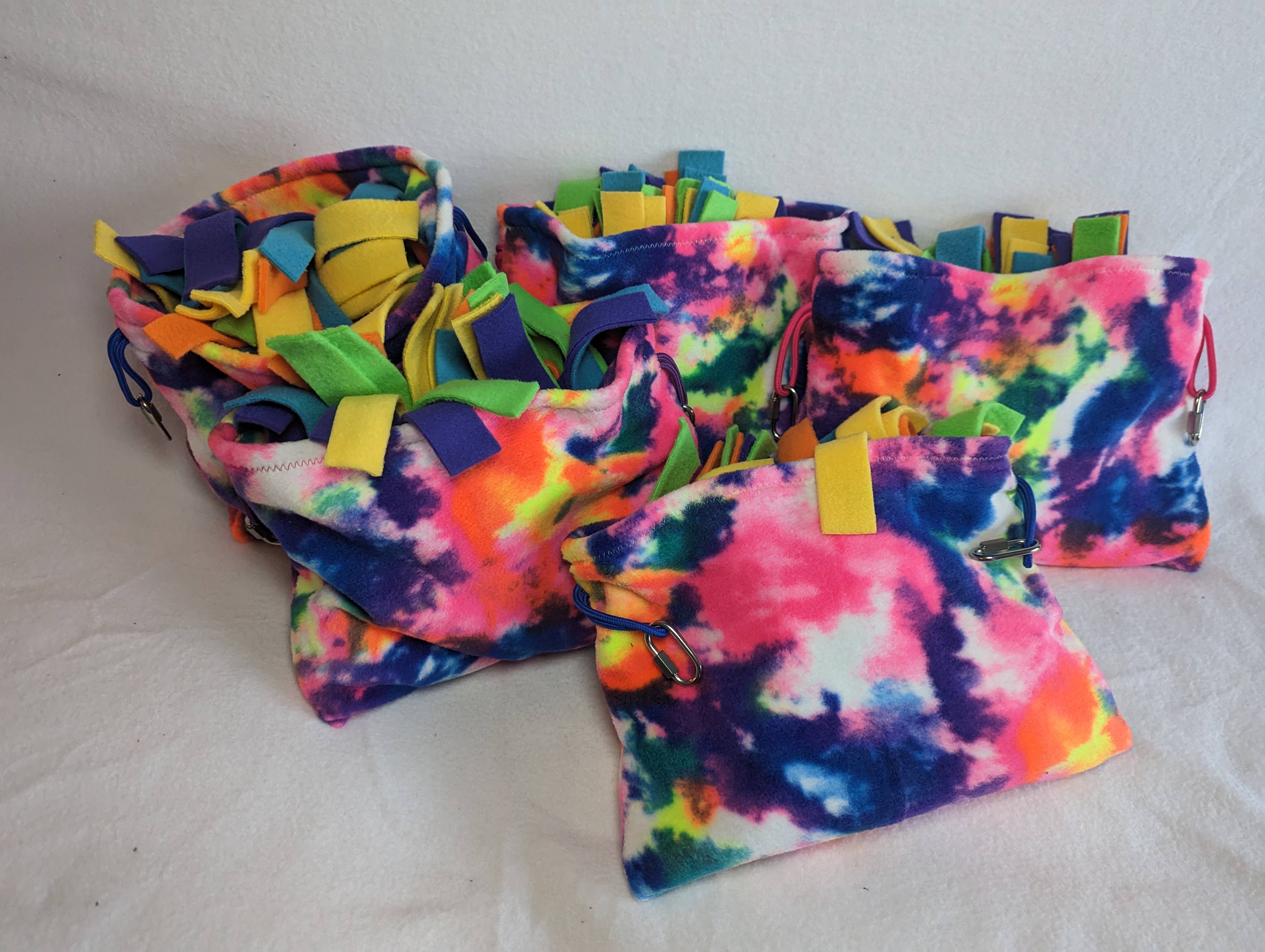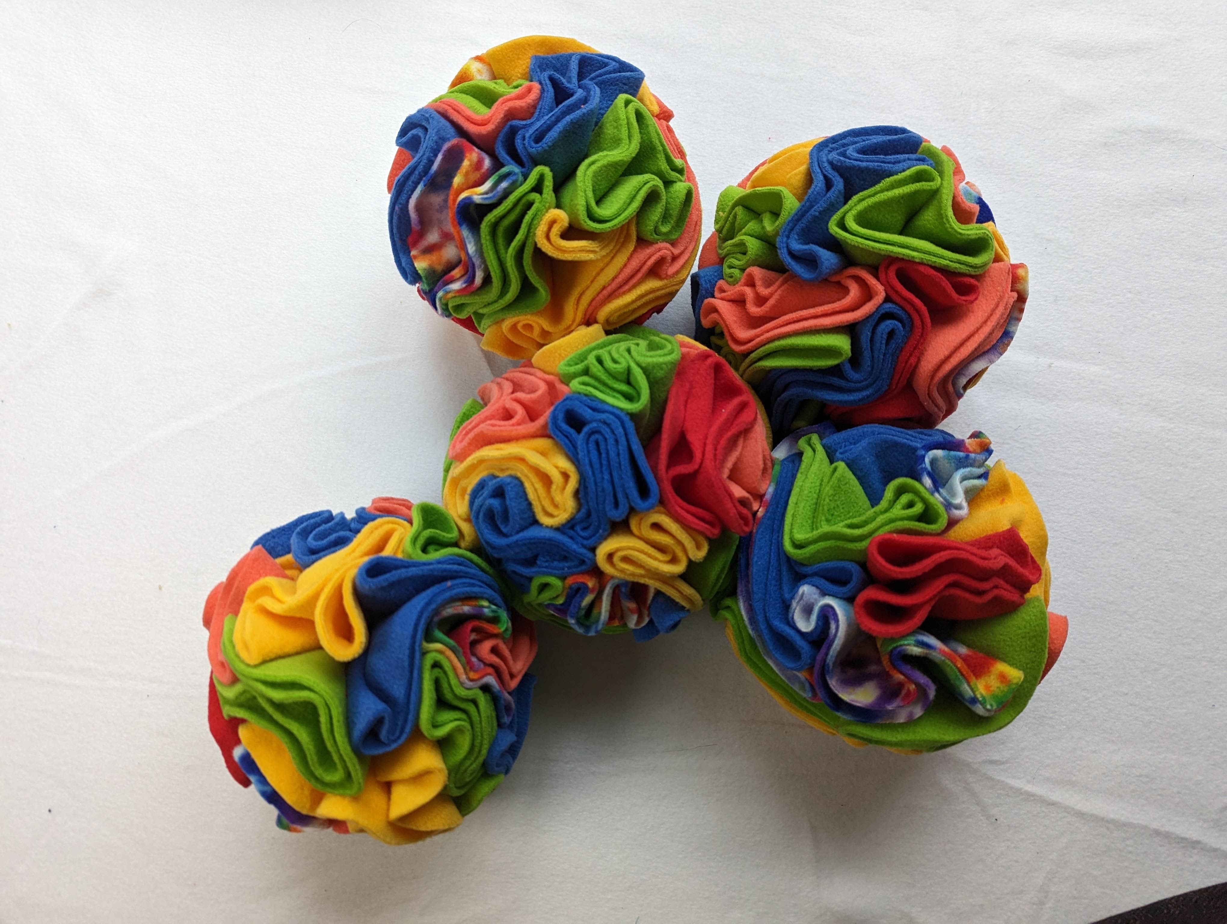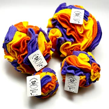 This is a 6" diameter ball made of high quality luxury anti pill fleece with plenty of places for treats. Snuffle balls make enrichment awesome with a more active food finding experience! Let your pet have fun finding their food in the dozens of potential pockets. This small ball has big possibilities - use it on its own or as part of a foraging or enrichment box! **Product photos are not exact representations - these are custom made so please specify your colors. If no colors are specified, colors will be a surprise** Recommended for dogs under 20 pounds, cats, rabbits, ferrets, and other small pets. This product is not meant to withstand chewing tugging, or rough play. We recommend not leaving pets prone to destruction unsupervised. All our products are machine washable and dryer safe! Every order is custom colored and made to order - max 4 colors per case (5 units)