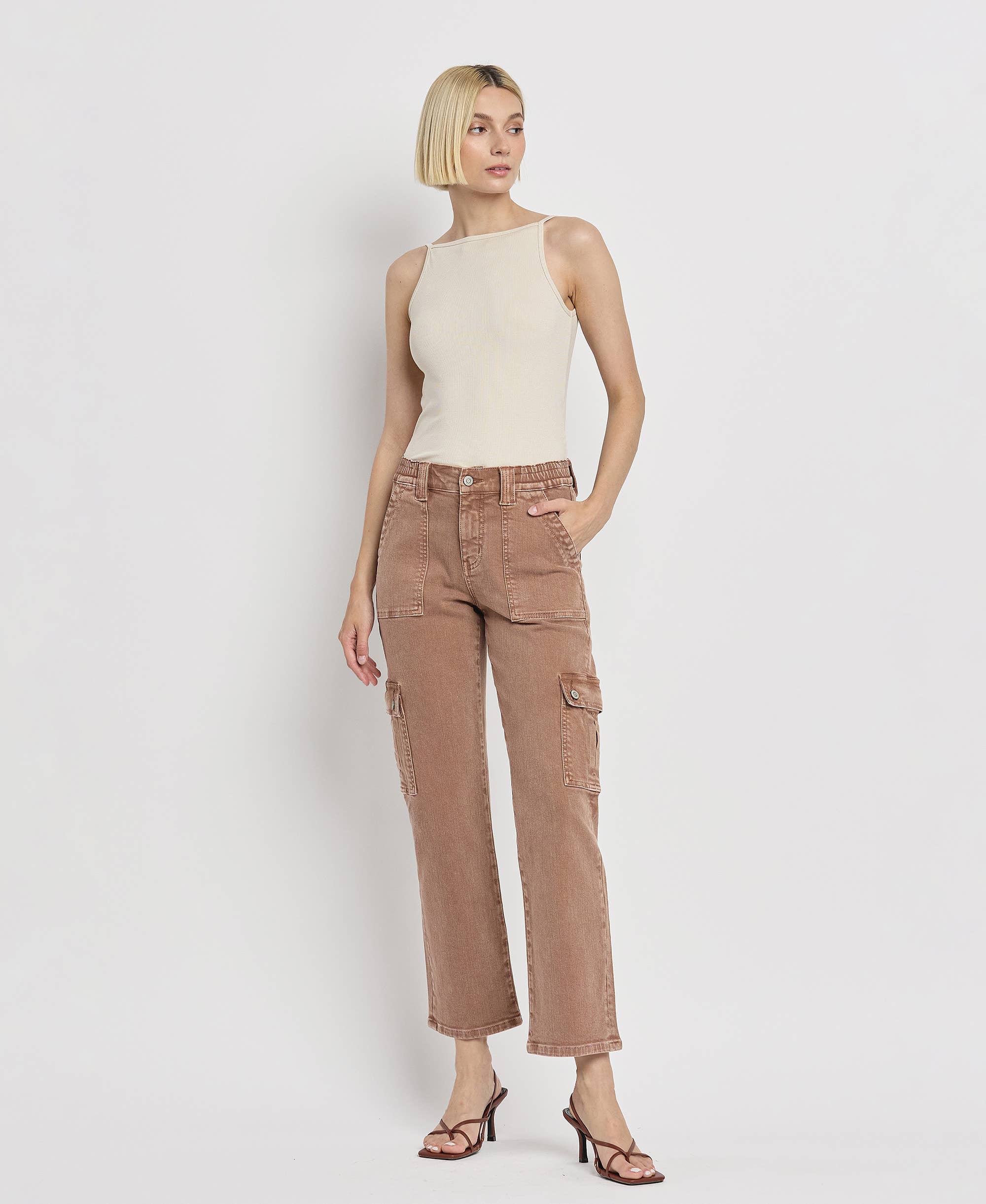 MID RISE SLANT STEP HEM CROP KICK FLARE JEANS COMFORT STRETCH DENIM, MID RISE WAIST, DISTRESSED DETAIL, SLANT STEP HEM, CROPPED LENGTH, KICK FLARE JEANS F. RISE: 9" / INSEAM: 27" / LEG OPENING: 16" MODEL IS 5'10" WEARING A SIZE 26