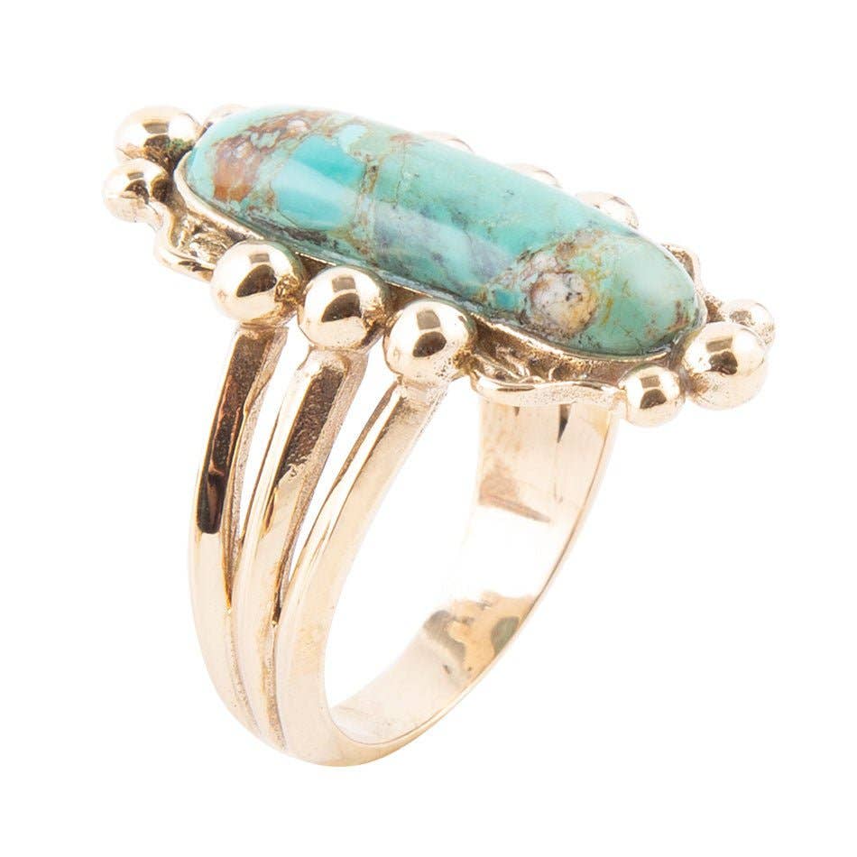 This Sedona Turquoise Goldstone Statement Ring is a luxurious piece of jewelry with an impressive design. Hand crafted with genuine turquoise and goldstone for a sparkling finish, and rustic bronze for an earthy touch. The 1.5 inch length and 1 inch width make it a bold fashion statement an individual artisan can take pride in. Make a statement with a one-of-a-kind ring! Turquoise Description: Turquoise is celebrated for its distinct blue-green color and veined patterns, with hues ranging from aqua blue to green depending on the copper and iron content. This ancient gemstone has been valued for millennia, often set in silver for jewelry and used in ceremonial pieces. Its unique texture and color make it a favorite among artisans and collectors. Fun Fact: Turquoise is believed to protect the wearer from negative energy and bring good fortune. It is unique in having a color named after it, emphasizing its deep cultural and historical significance. Natural variances are part of the beauty of our genuine stones. Your piece will vary slightly from the image shown.