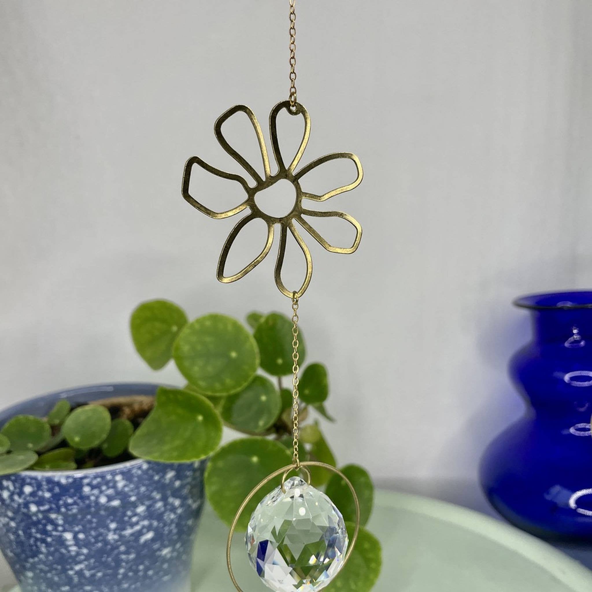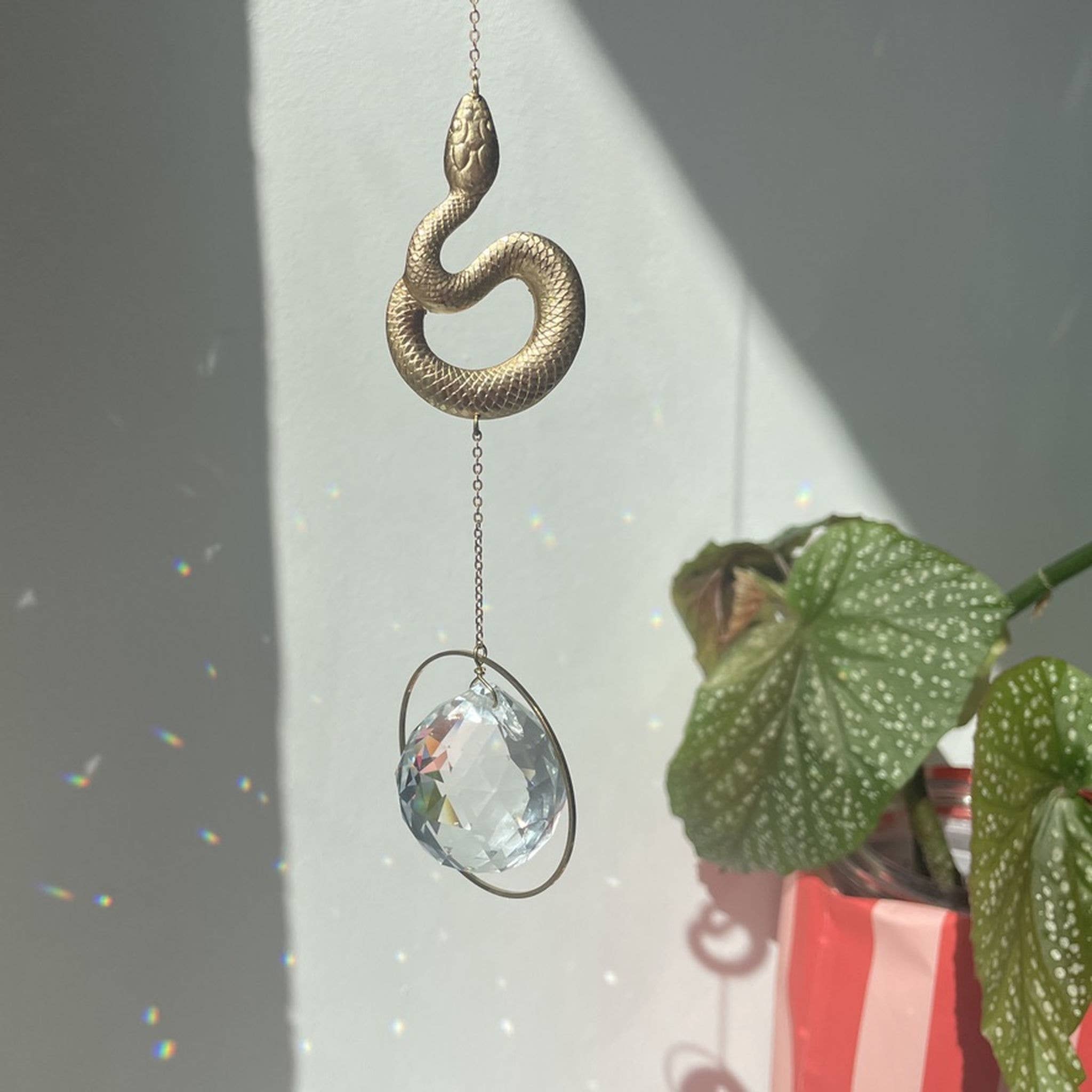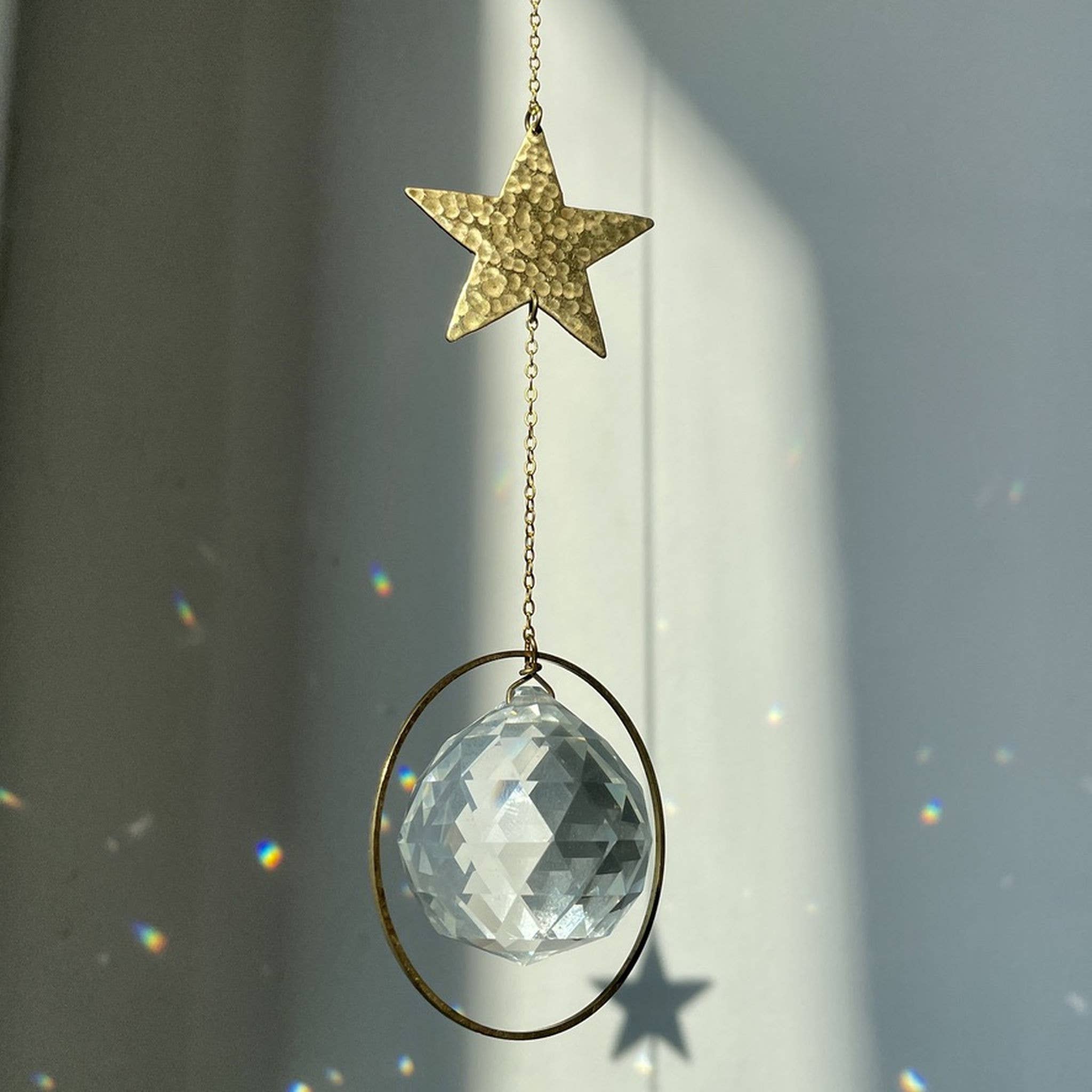 Sun Catcher – a gift that gives light Sun catchers – also known as suncatchers or light catchers – are magical objects that capture sunlight and transform it into floating rainbow points. When light passes through the faceted crystal prism, colorful reflections dance across walls, floors, and faces – a silent moment full of joy. Each light catcher is attached to a gold-colored brass chain and features a delicate leaf element with three points as a symbol. It stands for balance, growth, and the power of nature. Even on gray days, the crystal remains a stylish eye-catcher – in the window, on the balcony, or in the garden. A special gift for a birth, a birthday, or just because. For people of all ages who want to give light. Crystal glass prism approx. 3 cm, brass chain approx. 50 cm. Hanging with hook or loop. Packaged in tissue paper and decorative gift box with print.