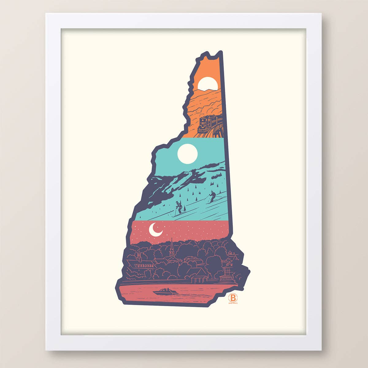 A group of friends explore the coastline of Portsmouth, NH along the Piscataqua River, passing by Portsmouth's historic South End neighborhood. - Signed by the artist. - Printed on archival quality fine art matte paper using inks engineered for superior quality and longevity. - Packaged in commercially compostable clear PLA sleeves, with cardboard backing. - Sold unframed. Previews with frames are for illustration purposes only. Available Sizes - 8"x10" - 11"x14" For ease of framing, these prints are sized to fit in standard frames without a mat. Due to lighting and different devices you might be using, the color in the image may vary slightly from the actual color of the print.