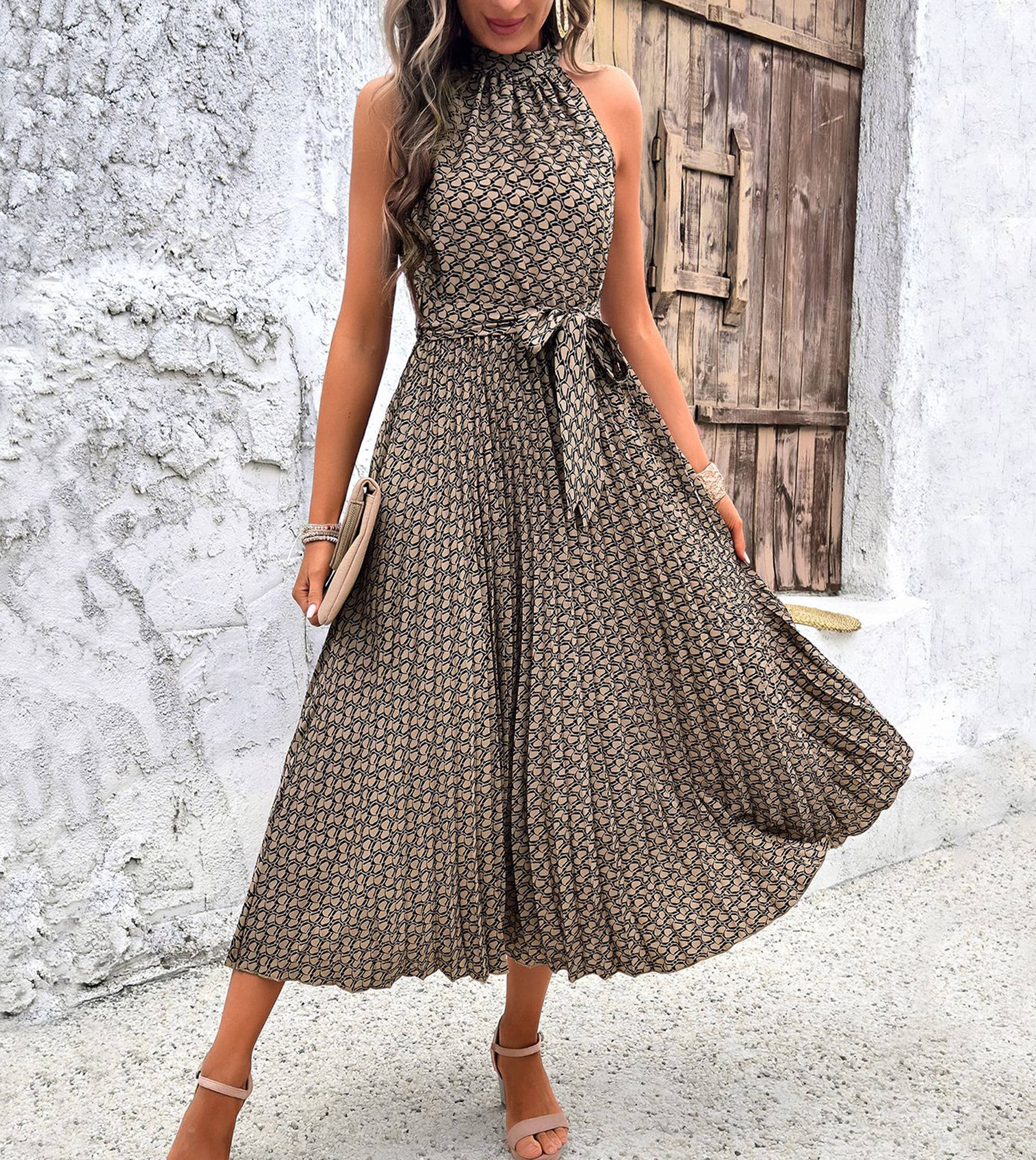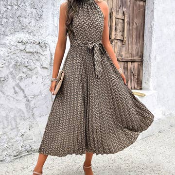 SKU: D432 Made in China Color: Brown Dress Style: A-line Fit: Contemporary Neckline: Halter Season: Spring/Summer Skirt & Dress Length: Knee Sleeve Length: Sleeveless Weight: 340.19 g (12 oz)