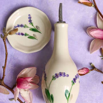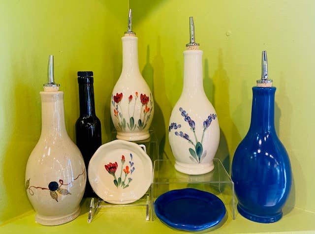 Holds 2 1/2 cups Embodying our goal of functional and beautiful our Drizzle Bottles are the perfect stoneware vessel for any cooking oil or vinegar - with a cork dispenser to easily pour. Available in both hand-painted designs and solid colored glazes. All of our pottery is made by artisans in Bedford, VA to be used daily as functional art. MAP pricing enforced. All Content and Designs Copyright Emerson Creek Pottery, Inc. All Rights Reserved. Emerson Creek Pottery is a Registered Trademark.