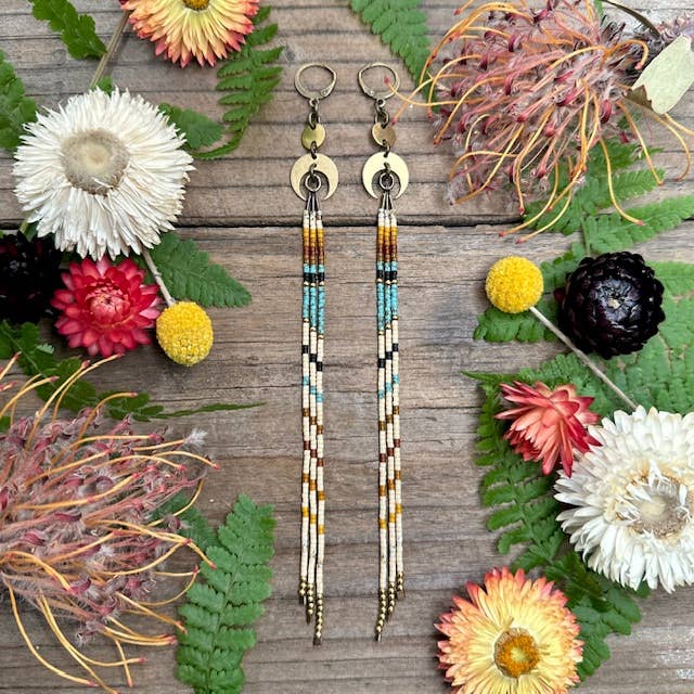 Handmade from raw brass with a natural patina and glass seed beads 7 inches long Each earring weighs 3 1/2 grams Brass leverback ear hooks