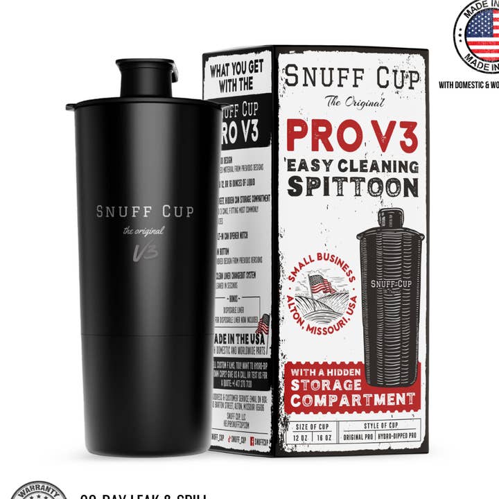 *We recommend watching the video below before buying! Nobody likes nasty spit water bottles. Based on customer feedback, we took our original Snuff Cup design, and made it way better. Note: Any orders for other Snuff Cups where "pro" is not specified will be for our old, original version! Features of the Snuff Cup Pro: ✓ An improved version of our 3.0 flip-top lids Each Snuff Cup pro comes with a flip-top style lid similar to the lids used on the original, but now with an air valve system to make sure the lid stays shut. We also added two small notches on the sides of the lid, so that you don't have to put your hand inside the lid to remove it! ✓ Now compatible with our disposable liners (not required for use) After getting lots of feedback from customers, we have decided to also make the Snuff Cup Pro compatible with removable, disposable liners! The Snuff Cup Pro has a threaded, easy to use removable liner system, making the cleanup process even simpler than before. ✓ Now fitting more than just standard can sizes We didn't just upgrade the lid and add a liner, we also upgraded the can storage system. The Snuff Cup pro can hold not only your standard sized cans, but also most oversized nic-free cans that are the same size as Red Seal. Store up to three cans at a time with the pro! ✓ Available in two different sizes, 12 and 16-ounce Along with a 12-ounce spitter similar to the old original Snuff Cup, we have also added a larger 16-ounce option for the Snuff Cup Pro! You can now store up to 16 ounces of liquid in the top portion of our Snuff Cup Pro. ✓ Built-in magnet works great with metal The Snuff Cup Pro also has a built-in magnet on the bottom of the cup! This works great with just about any metal surface. You can now attach your Snuff Cup Pro to just about any metal surface, reducing the chances that it'll tip over. Disclaimer: We do not promote the use of tobacco products! While our Snuff Cup Pros may fit other cans, we only suggest they be used for products which don't contain tobacco/nicotine, such as jerky cans, or sunflower seeds!