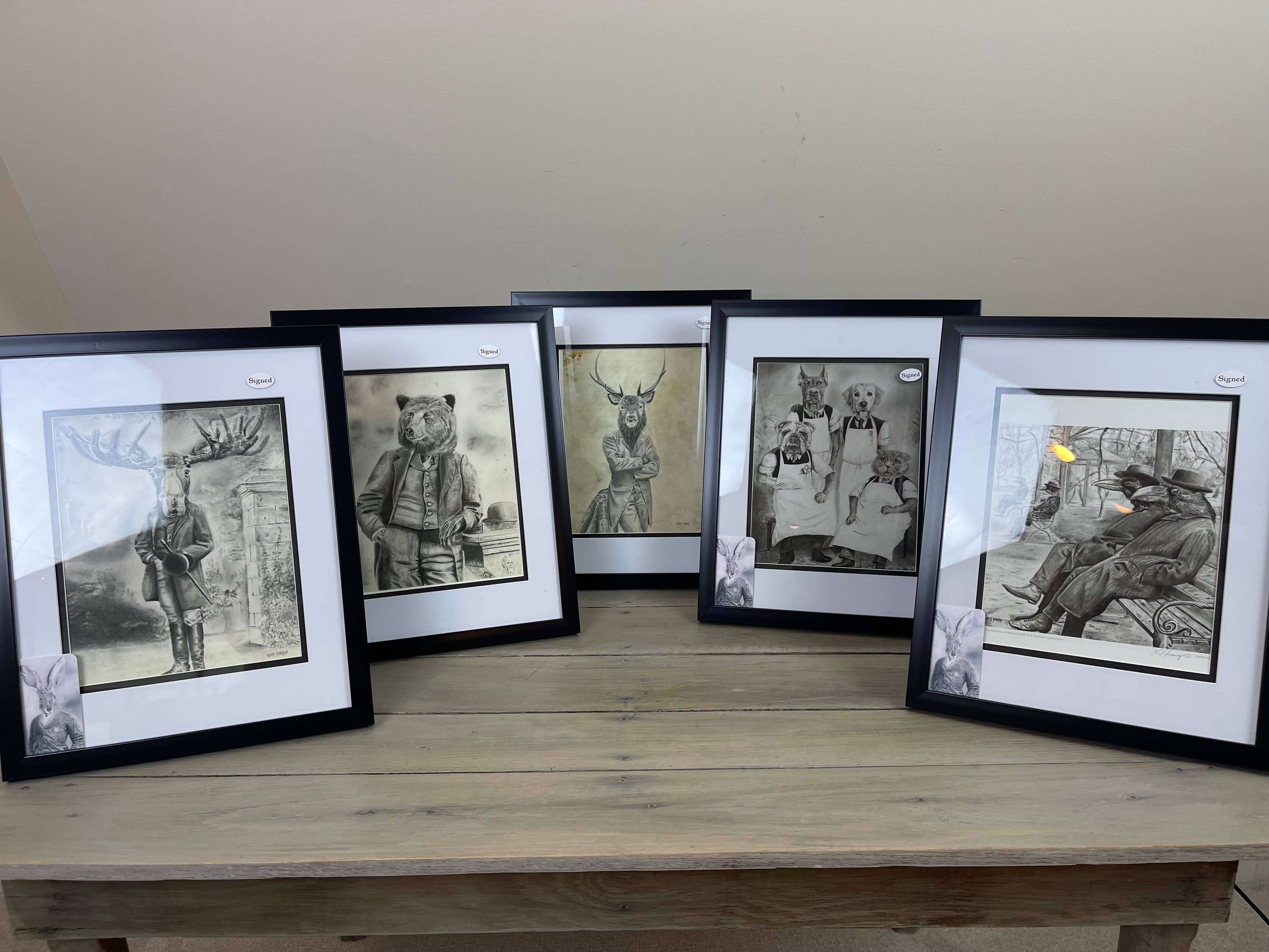 This print is part of 'The Anicurio Collection' by British artist Keith Harrop. Original pencil drawings in the style of Victorian, vintage photographs Print size: 8.5" x 11". Bag size is: 9" x 12" Prints are signed by artist Keith Harrop Each comes with a clear bag and protective backing card. Print finish: Matte Label on the top right corner of the bag says 'SIGNED' If you're an animal lover or just like the weird, bizarre, and unusual. You will find Victorian owls in hot air balloons, alligators in top hats, Flamingoes in tuxedos, a squirrel photographer, elephants on bicycles, raccoons in pubs, dancing mice, cats at the seaside, chickens in Sunday bonnets, stags in suits, crows in coats, and so very much more. In fact, 50 total characters within this beloved series. This immersive Victorian world was a six-year project by the artist, who chose to end the collection at 50 pieces. The Anicurio™ collection appeals to animal lovers, fans of Victorian vintage and collectables, cartoons, steampunk and gothic art, and all things weird and unusual. This series has inspired a loyal following of collectors.