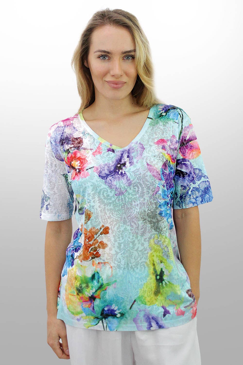 Turn heads with this stunning sheer top featuring vibrant multicolored floral embroidery that creates a whimsical and feminine look. This short-sleeve design is crafted from lightweight, breathable fabric, making it perfect for layering over a camisole or tank for a chic yet playful style. The intricate floral details and pastel hues add a touch of elegance, while the sheer finish keeps it modern and versatile. Ideal for casual outings, brunch dates, or adding flair to evening wear, this unique top is a must-have addition to your wardrobe.