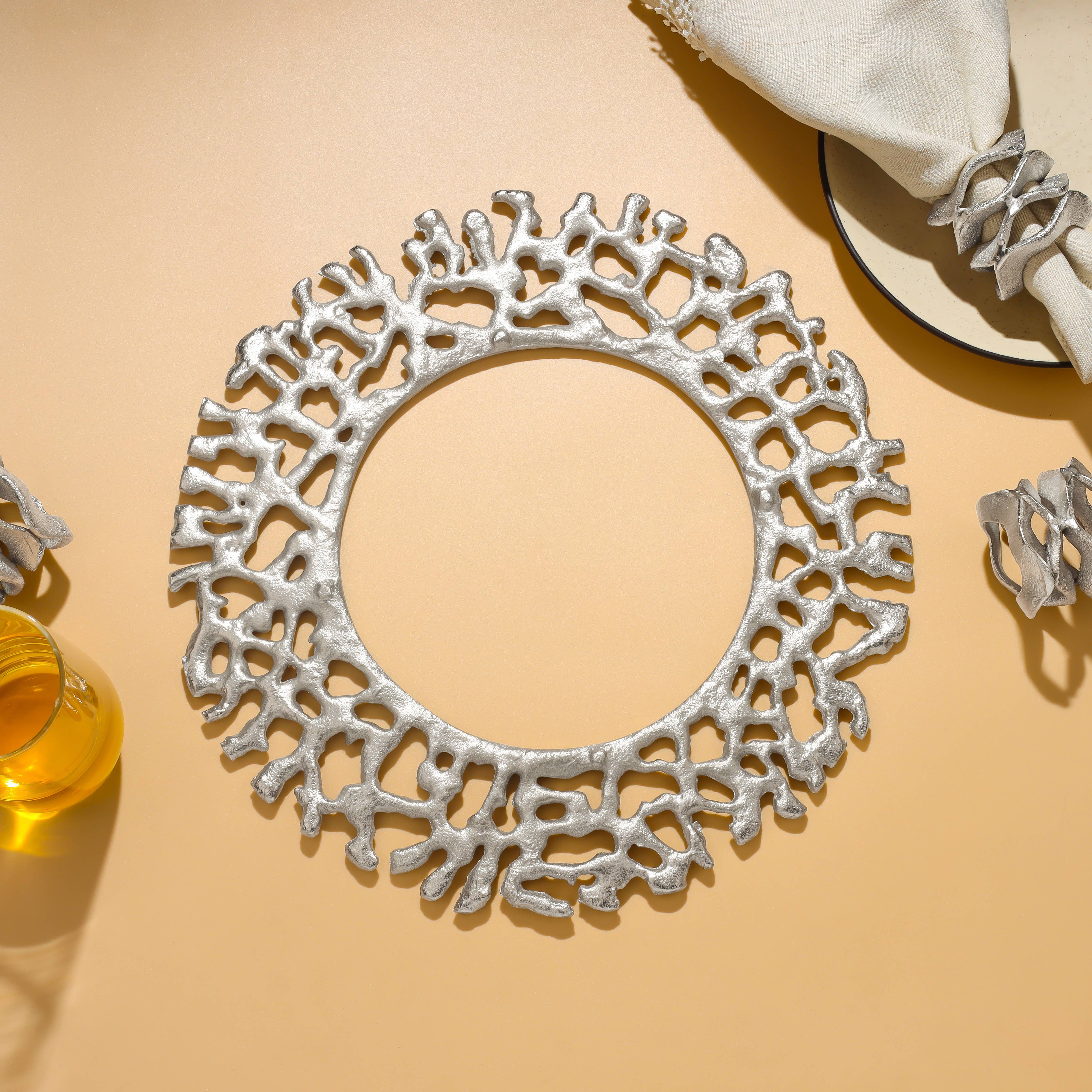 The Silver Shimmer Metallic Charger Plate captivates with its geometric openwork design, reminiscent of a delicate lattice. Its shimmering silver tone exudes modern sophistication, making it an excellent choice for upscale events or everyday elegance. Features: Exquisite lattice-inspired design with intricate detailing Shimmering metallic silver finish enhances visual appeal Perfect for creating an elegant tablescape or centerpiece Complements a wide variety of dinnerware styles and colors Easy to maintain—simply wipe clean after use