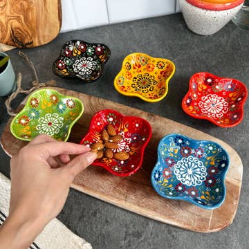 These cute ceramic bowls are handmade in Turkey. They can be used for dipping sauces, nuts, cheese boards, olives in the kitchen. Also, they can be used for storing jewelry, display... They are dishwasher safe. Our ceramics are handmade that is why they are all unique and genuine. The design on them can differ as we hate limiting the creativity of the maker. These are not machine-made items, and small imperfections may happen, and we call them signature of the maker, and I hope you can appreciate them. They come as a set of 6 in a craft box with bubblers giving extra protection. Although we try to get it stamped with "Handmade" at the bottom, some may be missing this detail. Please message us directly, if you have any chipped or broken ones, and we can gladly replace it for you. It is very important for my small business as reporting damaged without getting in touch affects my shop on Faire.