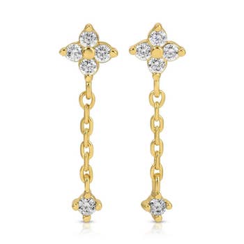The sharp and contemporary vibe offers the perfect balance of pretty and edgy. Wear them solo for a minimalist vibe or paired up with studs for a layered ear stack. The radiant sparkle of the cubic zirconia and the comfort of the wear will make these babies your new favorite "grab first" earrings. *18k Gold filled posts *18k Gold filled findings *Gold plated and cubic charms *All earrings come on repurposed leather for elegant and easy display